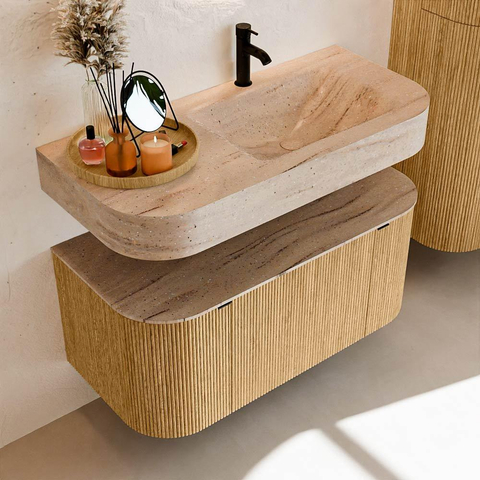MONDIAZ THOR-DLUX 100cm meuble de salle de bains arrondi gauche + droite couleur Chêne avec 1 tiroir et 2 portes. Vasque suspendue CLOUD Droite 1 trou de robinet couleur Saba.
