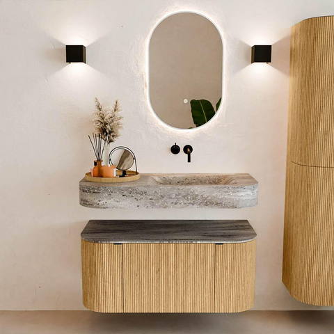 Matériaux naturels dans des tons chauds. Les nervures verticales apportent rythme et texture au design, tandis que le chêne confère une apparence chaleureuse et artisanale. Choisissez parmi 5 teintes de bois OAK, WALNUT, DUSK, SHADOW et RUBY, des couleurs de bois soigneusement sélectionnées pour enrichir les salles de bains modernes et classiques.