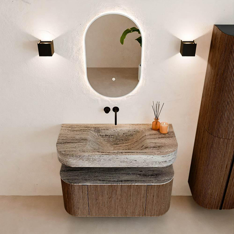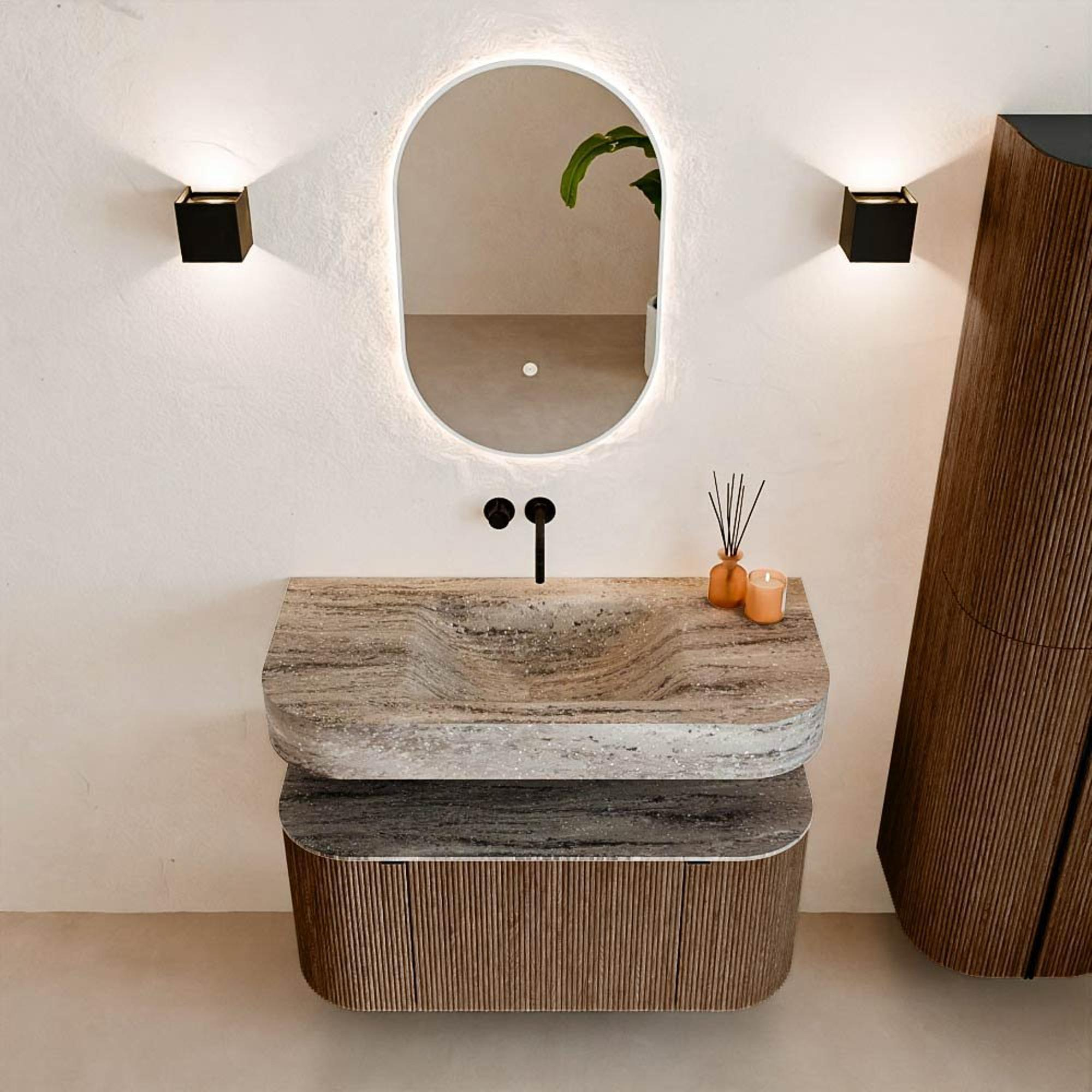 Matériaux naturels dans des tons chauds. Les nervures verticales apportent rythme et texture au design, tandis que le chêne confère une apparence chaleureuse et artisanale. Choisissez parmi 5 teintes de bois OAK, WALNUT, DUSK, SHADOW et RUBY, des couleurs de bois soigneusement sélectionnées pour enrichir les salles de bains modernes et classiques.