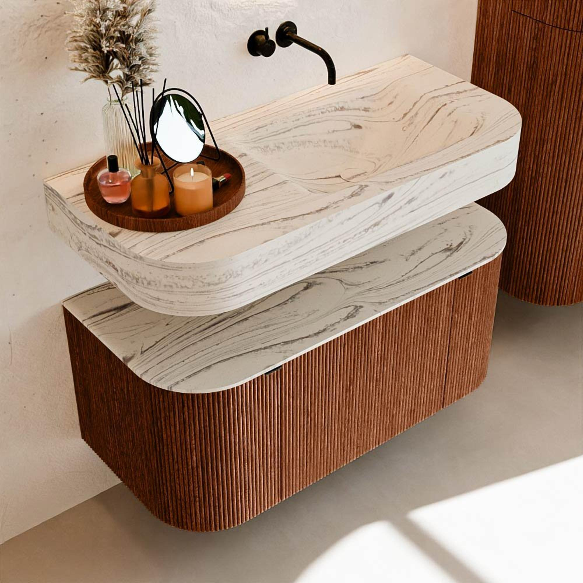 Matériaux naturels dans des tons chauds. Les rainures verticales apportent rythme et texture au design, tandis que le chêne confère une apparence chaleureuse et artisanale. Choisissez parmi 5 teintes de bois OAK, WALNUT, DUSK, SHADOW et RUBY, des couleurs de bois soigneusement sélectionnées pour enrichir les salles de bains modernes et classiques.