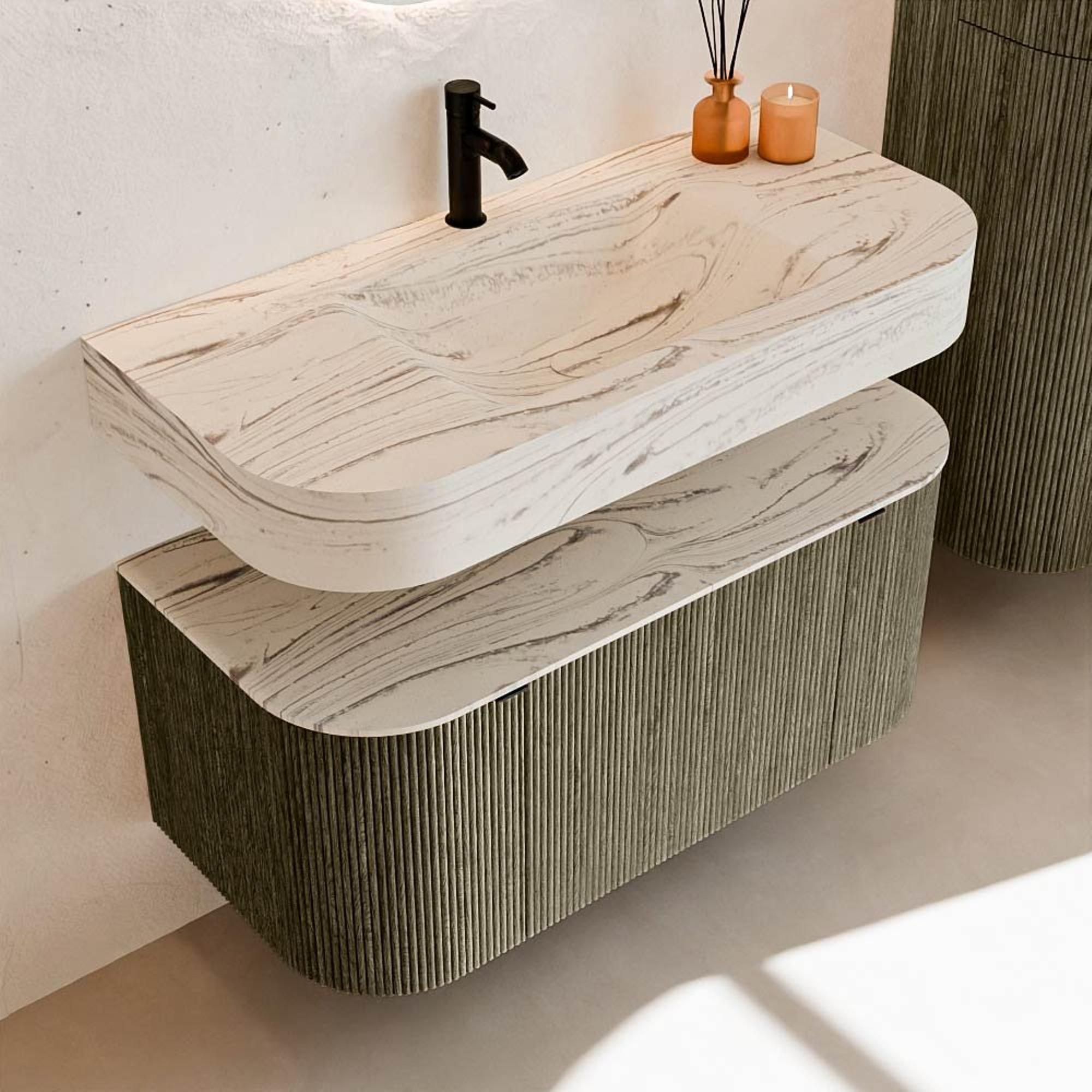 Au-dessus du meuble flotte une vasque suspendue assortie aux coins arrondis – parfaitement adaptée à la forme du meuble. La vasque est réalisée en Solid Surface et suit subtilement les lignes du meuble sous-jacent, créant ainsi un ensemble harmonieux. Le plan de travail en Solid Surface forme une base solide et facile d'entretien et complète la combinaison.