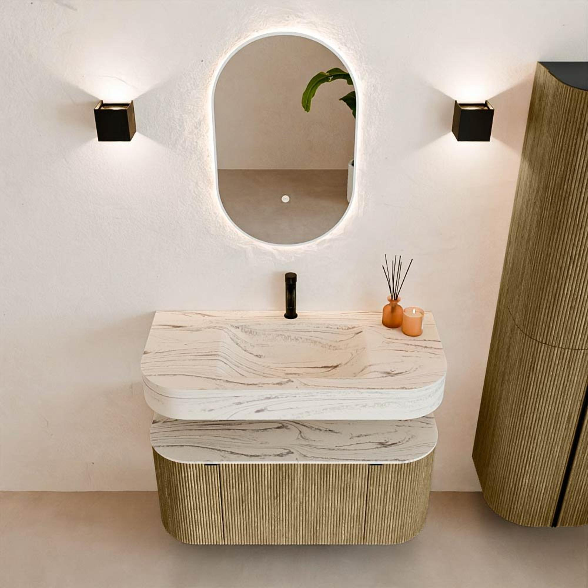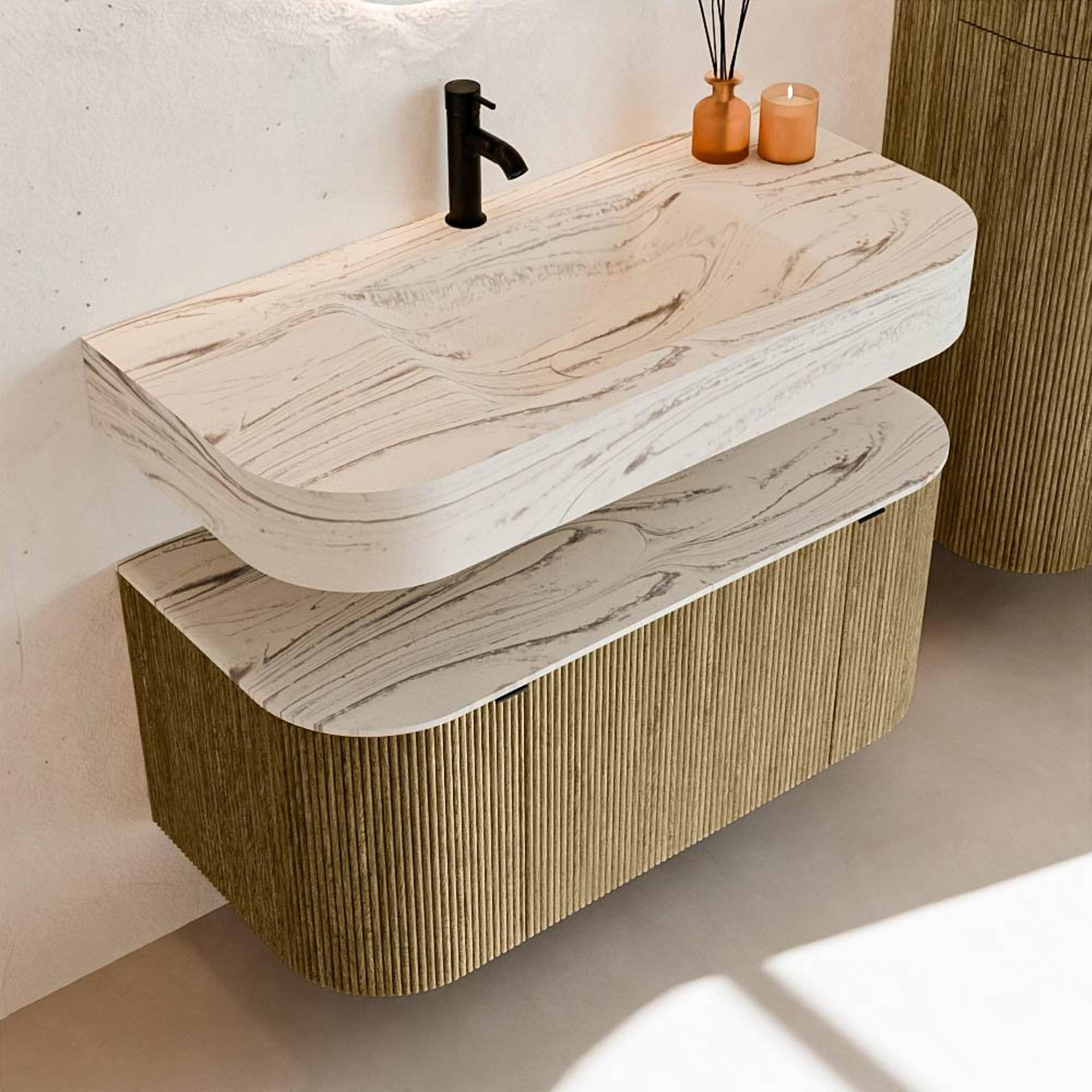 Matériaux naturels dans des tons chauds. Les rainures verticales apportent rythme et texture au design, tandis que le chêne confère une apparence chaleureuse et artisanale. Choisissez parmi 5 teintes de bois OAK, WALNUT, DUSK, SHADOW et RUBY, des couleurs de bois soigneusement sélectionnées pour enrichir les salles de bains modernes et classiques.