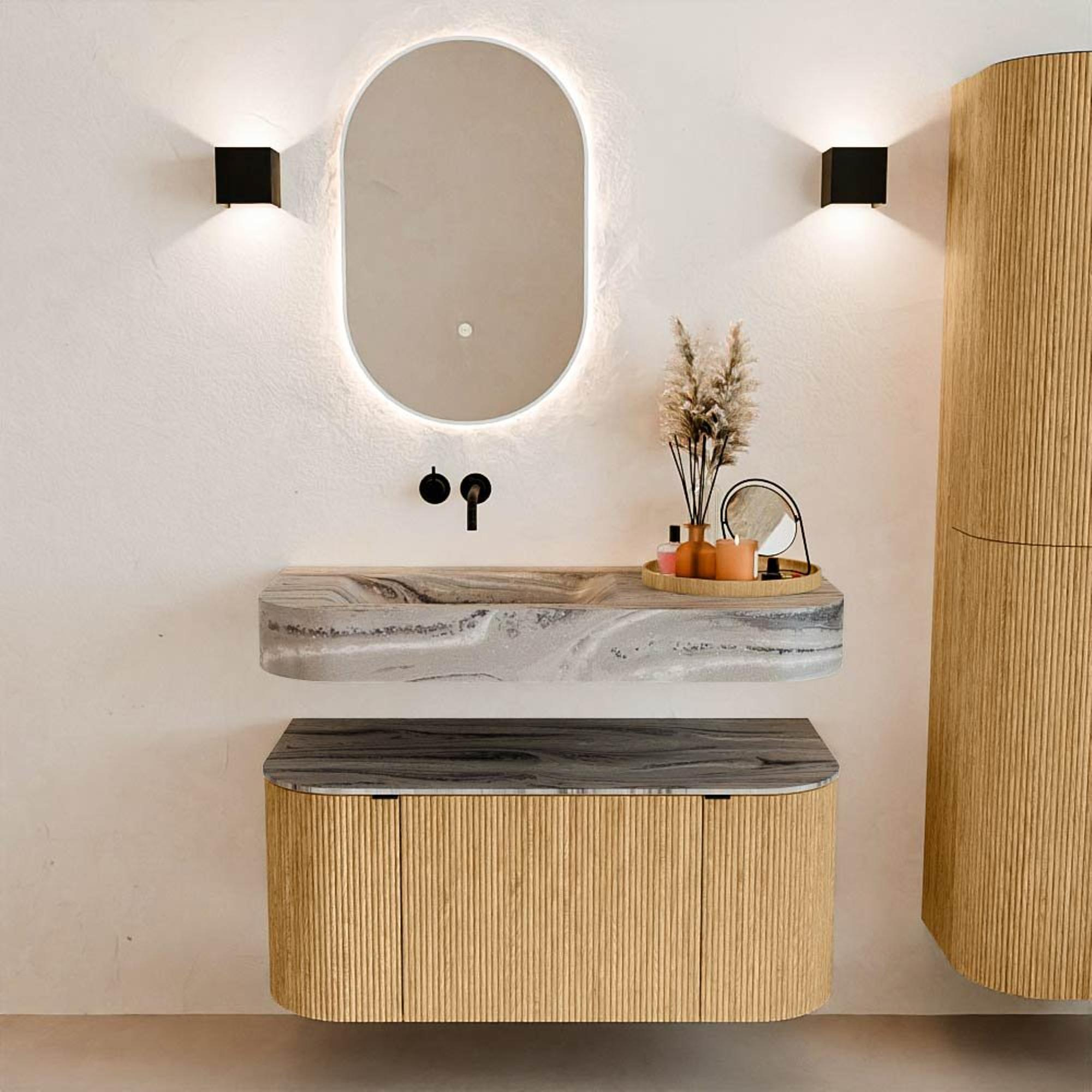 Matériaux naturels dans des tons chauds. Les nervures verticales apportent rythme et texture au design, tandis que le chêne confère une apparence chaleureuse et artisanale. Choisissez parmi 5 teintes de bois OAK, WALNUT, DUSK, SHADOW et RUBY, des couleurs de bois soigneusement sélectionnées pour enrichir les salles de bains modernes et classiques.
