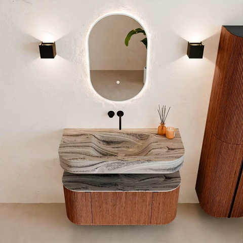 Matériaux naturels aux teintes chaudes. Les nervures verticales apportent rythme et texture au design, tandis que le chêne confère une apparence chaleureuse et artisanale. Choisissez parmi 5 teintes de bois OAK, WALNUT, DUSK, SHADOW et RUBY, des couleurs de bois soigneusement sélectionnées pour enrichir les salles de bains modernes et classiques.