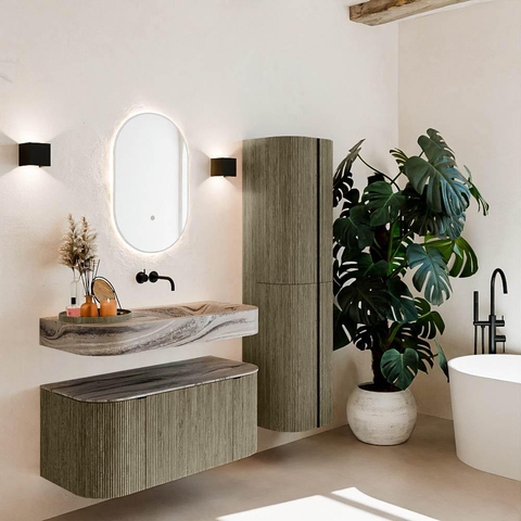 Matériaux naturels dans des tons chauds. Les cannelures verticales apportent rythme et texture au design, tandis que le chêne confère une apparence chaleureuse et artisanale. Choisissez parmi 5 teintes de bois OAK, WALNUT, DUSK, SHADOW et RUBY, des couleurs de bois soigneusement sélectionnées pour enrichir les salles de bains modernes et classiques.