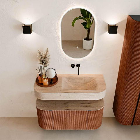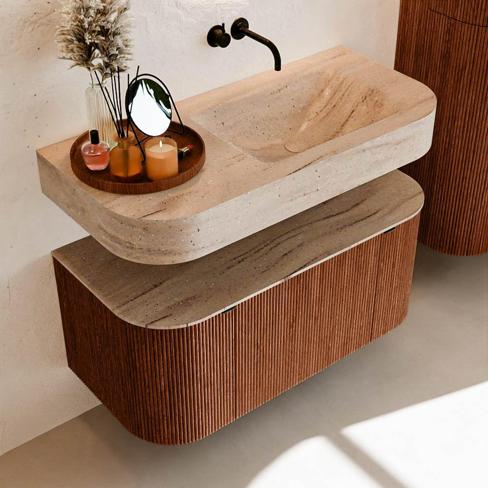 Matériaux naturels dans des tons chauds. Les nervures verticales apportent rythme et texture au design, tandis que le chêne confère une apparence chaleureuse et artisanale. Choisissez parmi 5 teintes de bois OAK, WALNUT, DUSK, SHADOW et RUBY, des couleurs de bois soigneusement sélectionnées pour enrichir les salles de bains modernes et classiques.