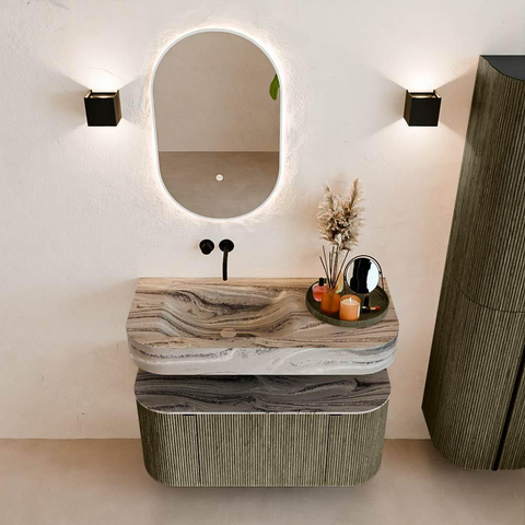 Matériaux naturels dans des tons chauds. Les rainures verticales apportent rythme et texture au design, tandis que le chêne confère une apparence chaleureuse et artisanale. Choisissez parmi 5 teintes de bois OAK, WALNUT, DUSK, SHADOW et RUBY, des couleurs de bois soigneusement sélectionnées pour enrichir les salles de bains modernes et classiques.