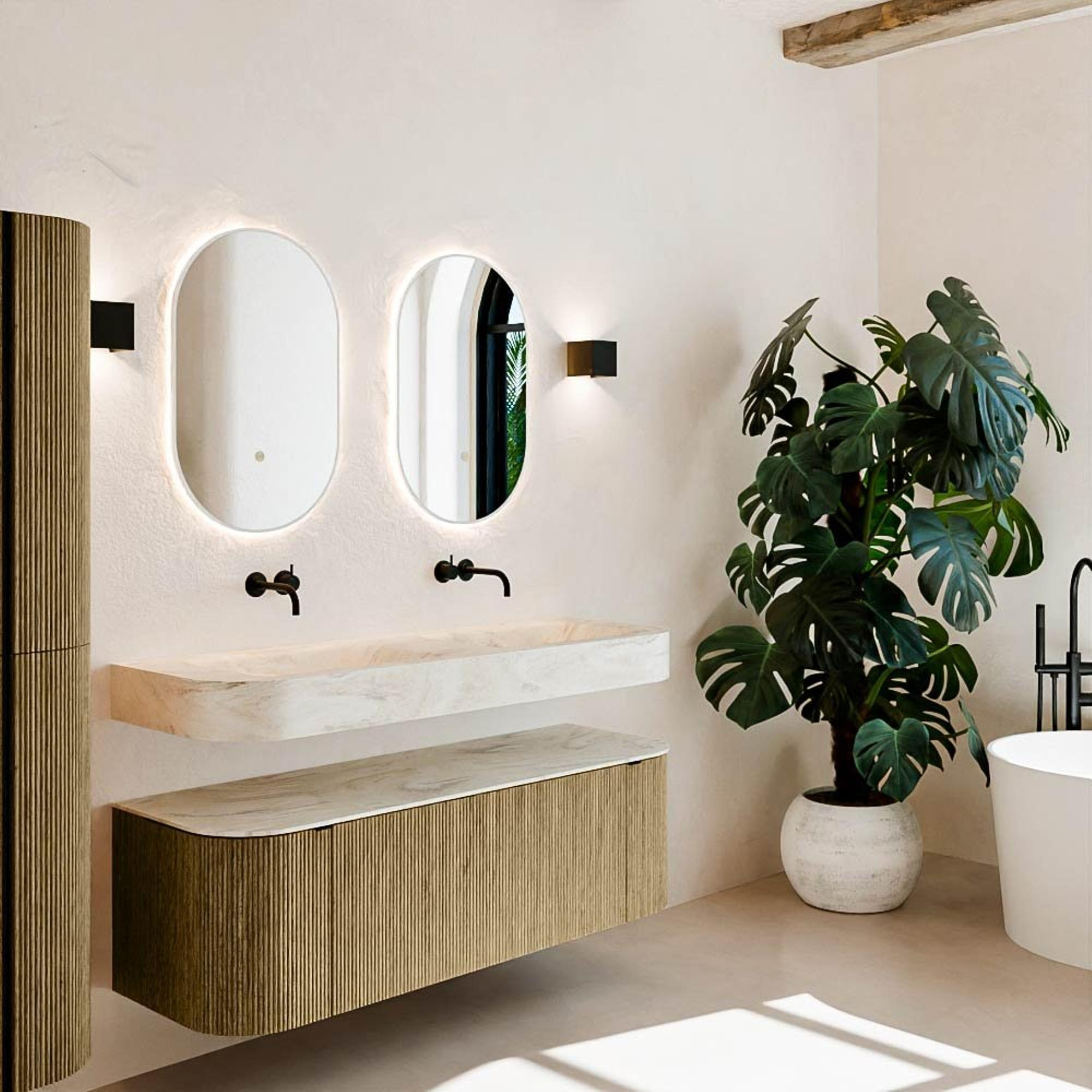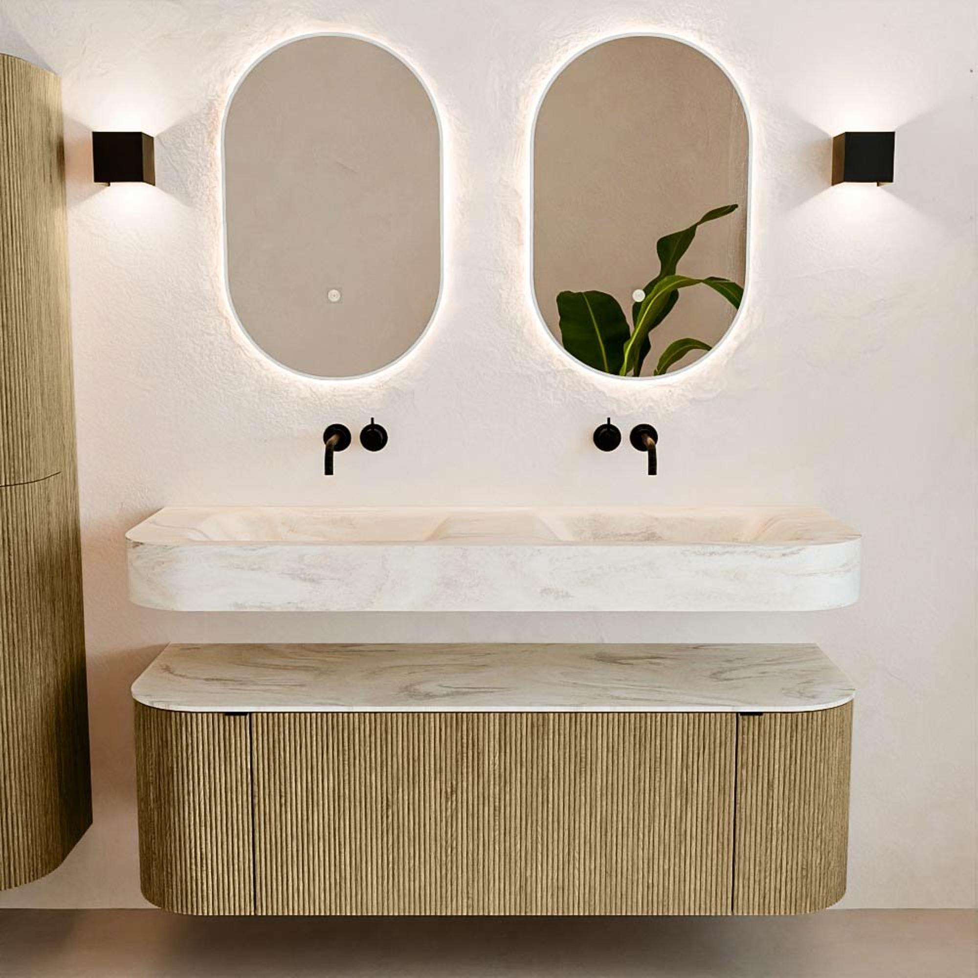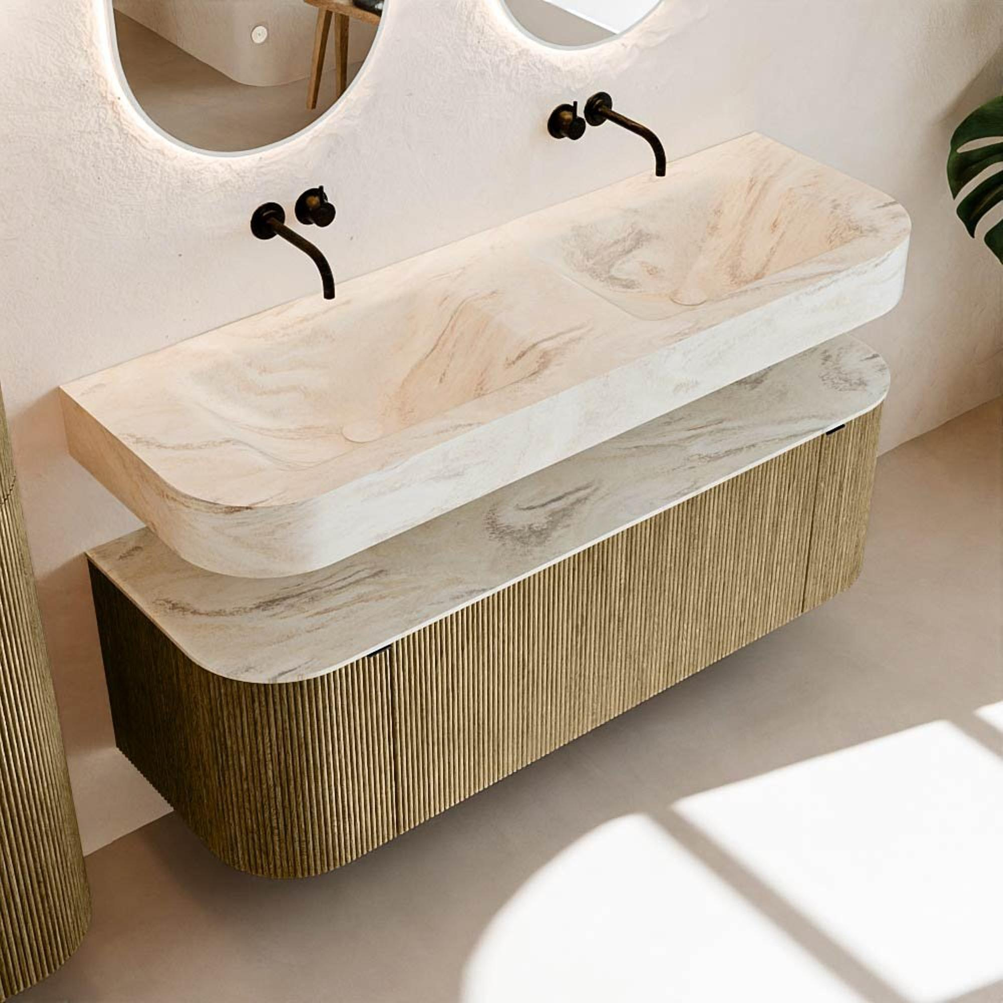 Matériaux naturels dans des tons chauds. Les nervures verticales apportent rythme et texture au design, tandis que le chêne confère une apparence chaleureuse et artisanale. Choisissez parmi 5 teintes de bois OAK, WALNUT, DUSK, SHADOW et RUBY, des couleurs de bois soigneusement sélectionnées pour enrichir les salles de bains modernes et classiques.