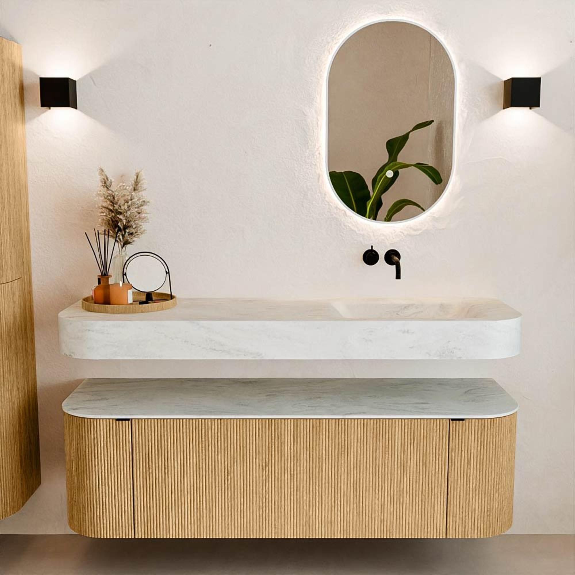 Matériaux naturels dans des tons chauds. Les cannelures verticales apportent rythme et texture au design, tandis que le chêne confère une apparence chaleureuse et artisanale. Choisissez parmi 5 teintes de bois OAK, WALNUT, DUSK, SHADOW et RUBY, des couleurs de bois soigneusement sélectionnées pour enrichir les salles de bains modernes et classiques.