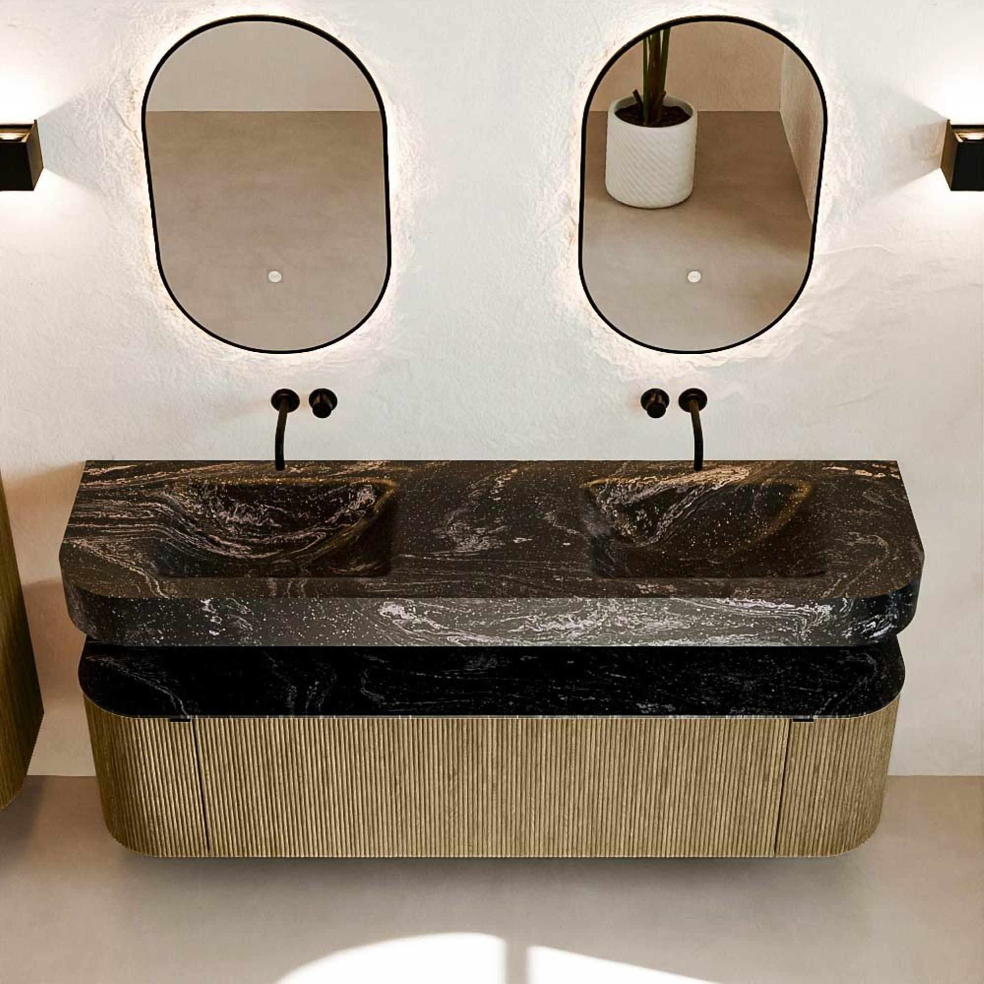 Matériaux naturels dans des tons chauds. Les nervures verticales apportent rythme et texture au design, tandis que le chêne confère une apparence chaleureuse et artisanale. Choisissez parmi 5 teintes de bois OAK, WALNUT, DUSK, SHADOW et RUBY, des couleurs de bois soigneusement sélectionnées pour enrichir les salles de bains modernes et classiques.