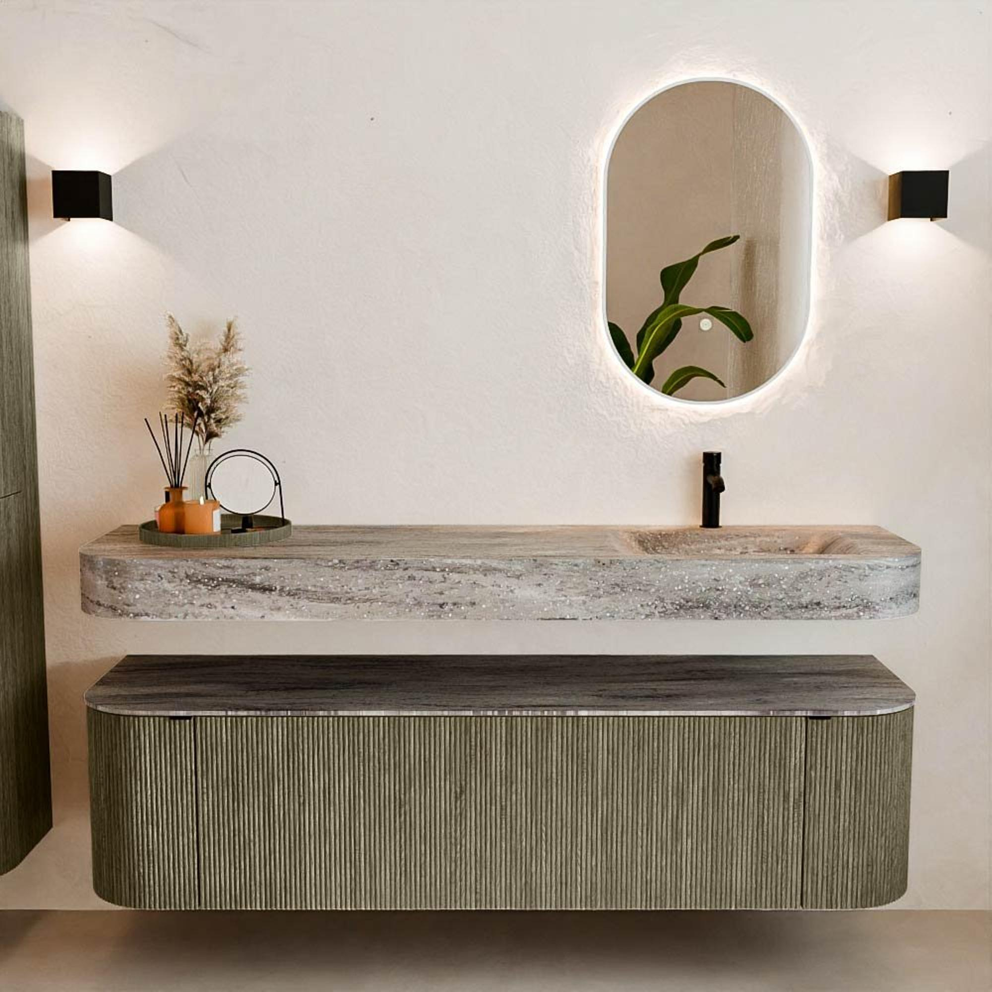 Matériaux naturels dans des tons chauds. Les nervures verticales apportent rythme et texture au design, tandis que le chêne confère une apparence chaleureuse et artisanale. Choisissez parmi 5 teintes de bois OAK, WALNUT, DUSK, SHADOW et RUBY, des couleurs de bois soigneusement sélectionnées pour enrichir les salles de bains modernes et classiques.
