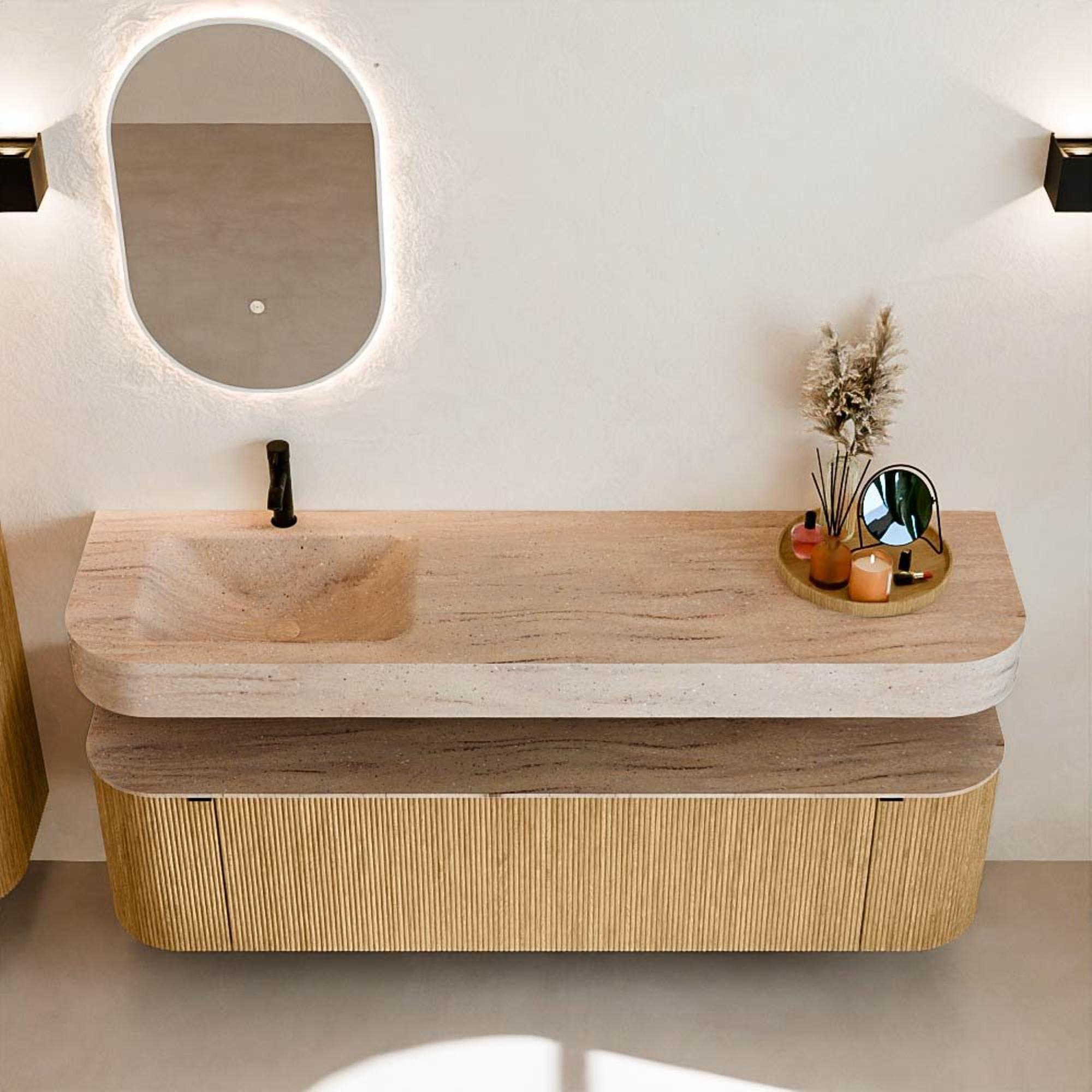 Au-dessus du meuble flotte une vasque suspendue assortie aux coins arrondis – parfaitement adaptée à la forme du meuble. La vasque est réalisée en Solid Surface et suit subtilement les lignes du meuble inférieur, créant un ensemble harmonieux. Le plan de travail en Solid Surface forme une base solide, facile d'entretien et complète la combinaison.