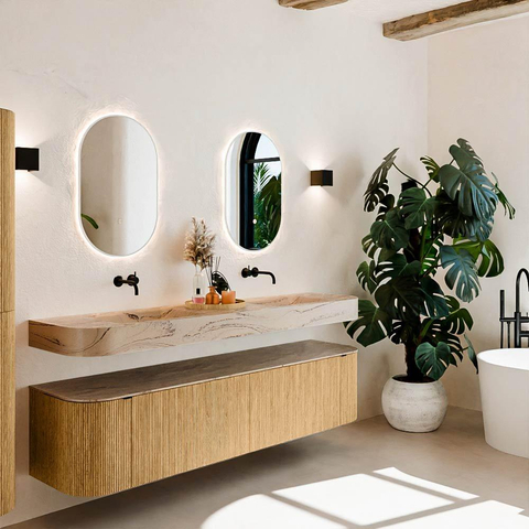 MONDIAZ THOR-DLUX 190cm meuble de salle de bains arrondi gauche + droite couleur Oak avec 2 tiroirs et 2 portes. Vasque suspendue CLOUD Double sans trou de robinet couleur Arena.