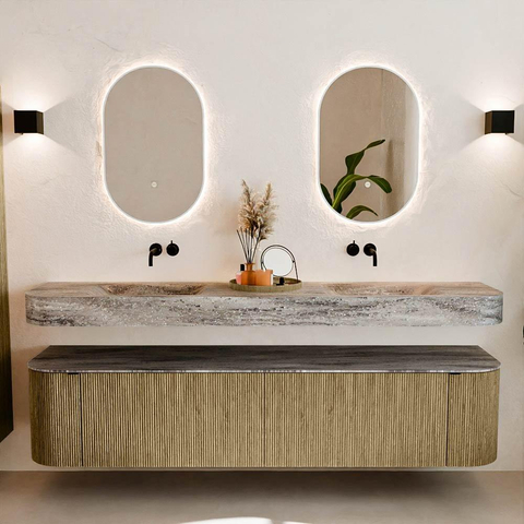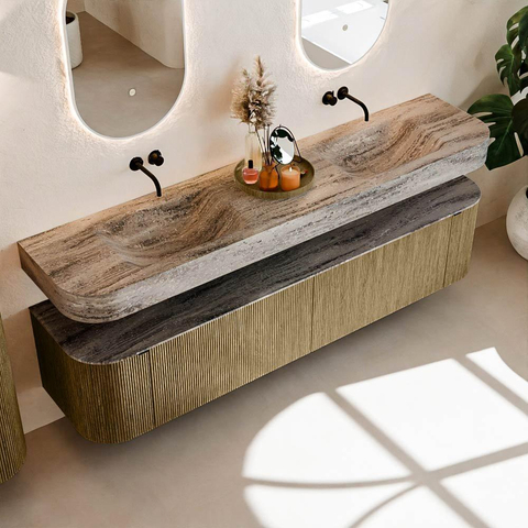 Matériaux naturels dans des tons chauds. Les nervures verticales apportent rythme et texture au design, tandis que le chêne confère une apparence chaleureuse et artisanale. Choisissez parmi 5 teintes de bois OAK, WALNUT, DUSK, SHADOW et RUBY, des couleurs de bois soigneusement sélectionnées pour enrichir les salles de bains modernes et classiques.