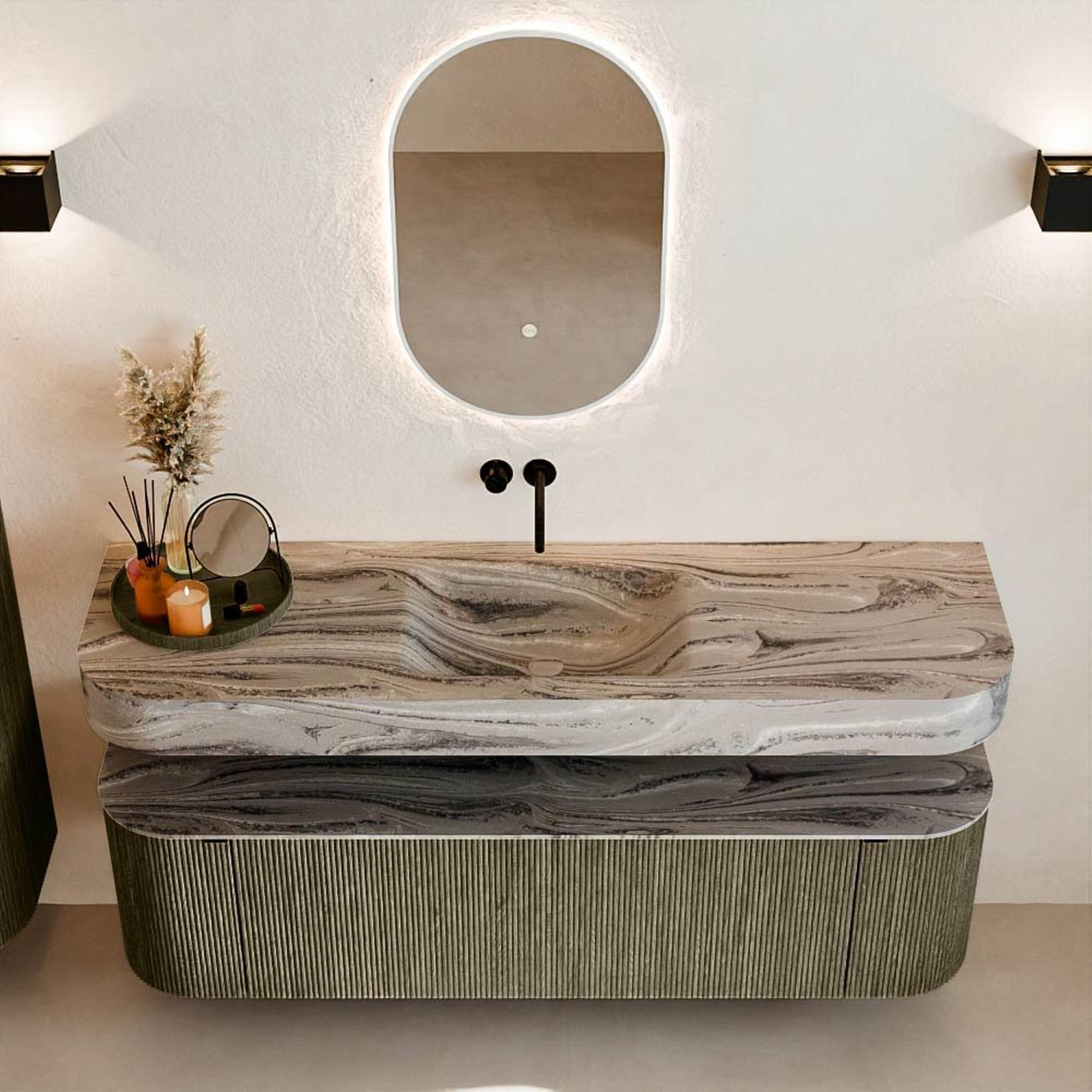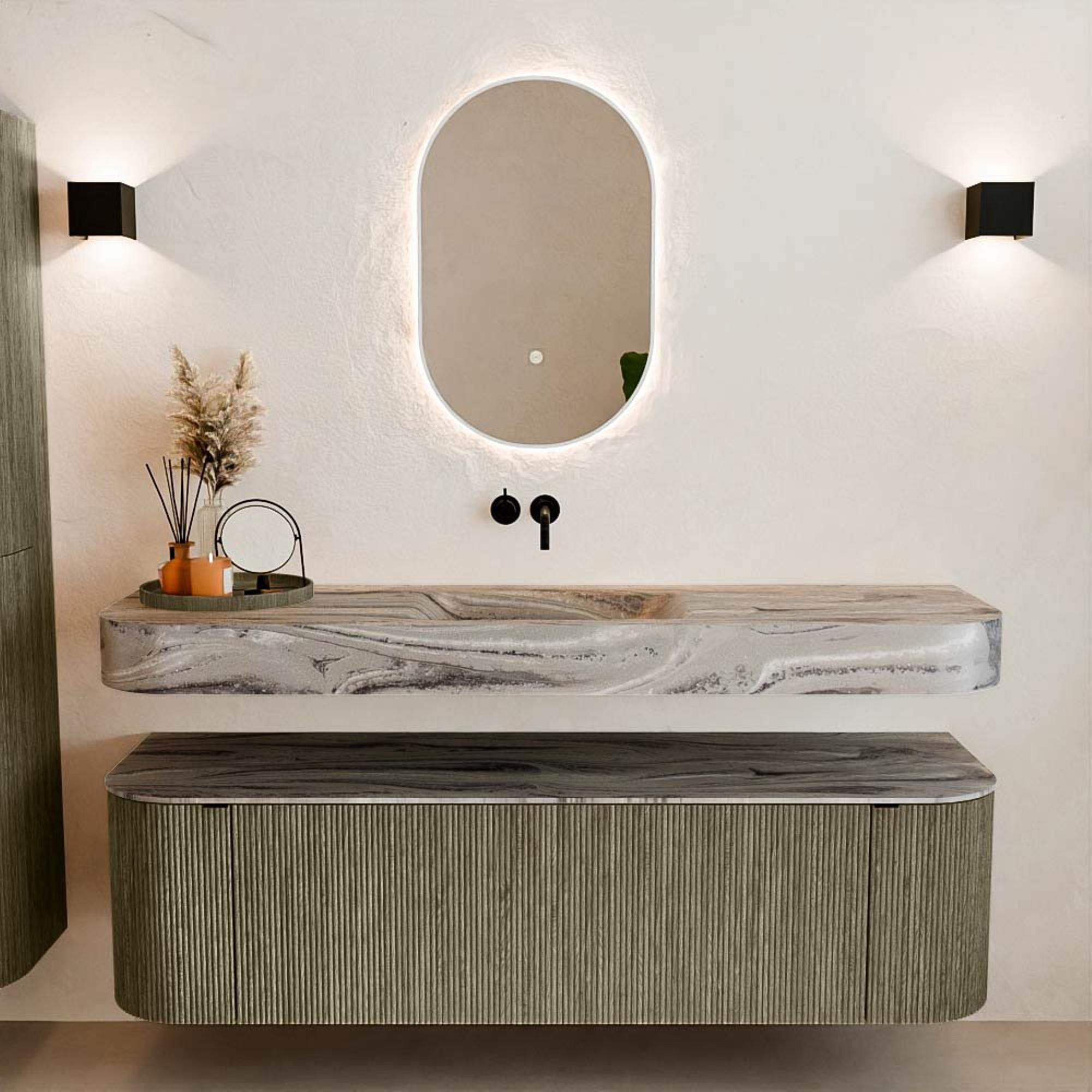 Au-dessus du meuble flotte une vasque suspendue assortie avec des coins arrondis – parfaitement adaptée à la forme du meuble. La vasque est réalisée en Solid Surface et suit subtilement les lignes du meuble inférieur, créant ainsi un ensemble harmonieux. Le plan de travail en Solid Surface forme une base solide, facile d'entretien, et complète la combinaison.