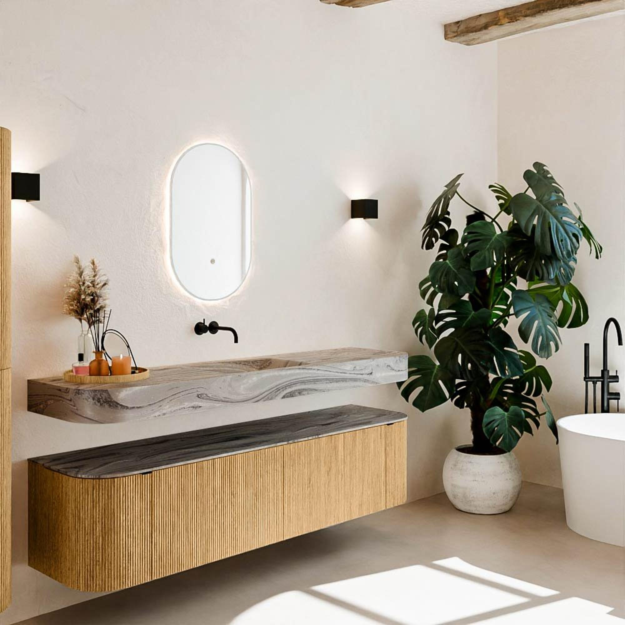 Matériaux naturels dans des tons chauds. Les nervures verticales apportent rythme et texture au design, tandis que le chêne confère une apparence chaleureuse et artisanale. Choisissez parmi 5 teintes de bois OAK, WALNUT, DUSK, SHADOW et RUBY, des couleurs de bois soigneusement sélectionnées pour enrichir les salles de bains modernes et classiques.