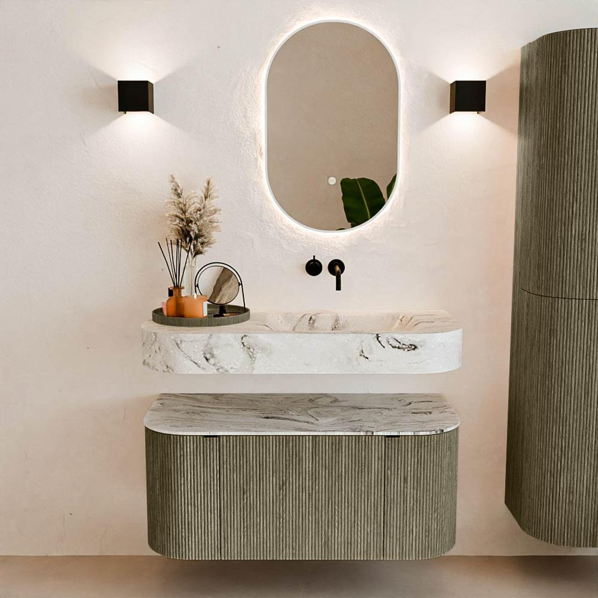 Au-dessus du meuble flotte une vasque suspendue assortie avec des coins arrondis – parfaitement adaptée à la forme du meuble. La vasque est réalisée en Solid Surface et suit subtilement les lignes du meuble inférieur, créant ainsi un ensemble harmonieux. Le plan de travail en Solid Surface forme une base solide, facile d'entretien, et complète la combinaison.