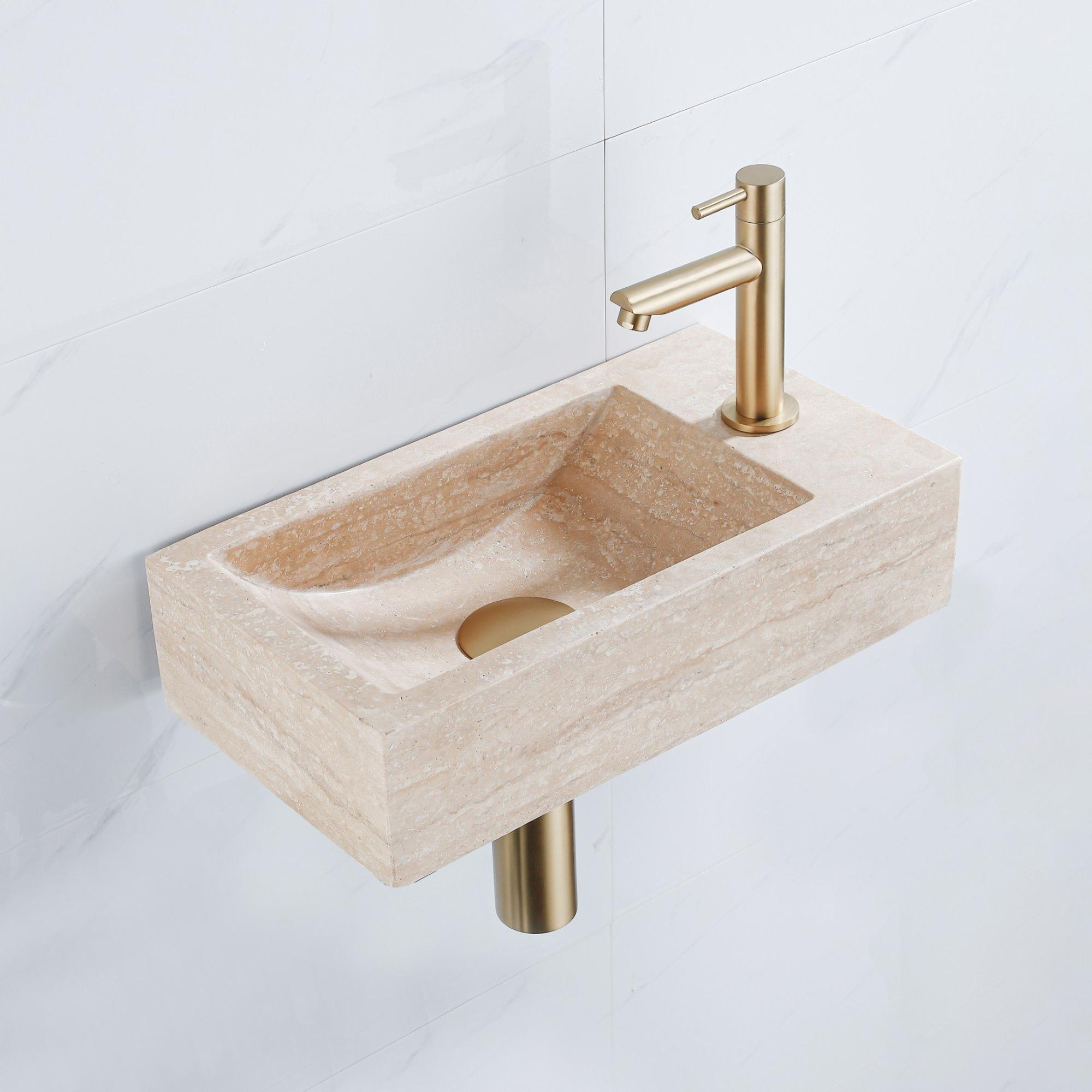 FugaFlow Eccelente Pietra Ensemble de fontaine - 40x22x10cm - trou de robinet à droite - robinet de fontaine en laiton brossé PVD - bouchon de vidange - siphon abaissé - pierre naturelle marbrée
