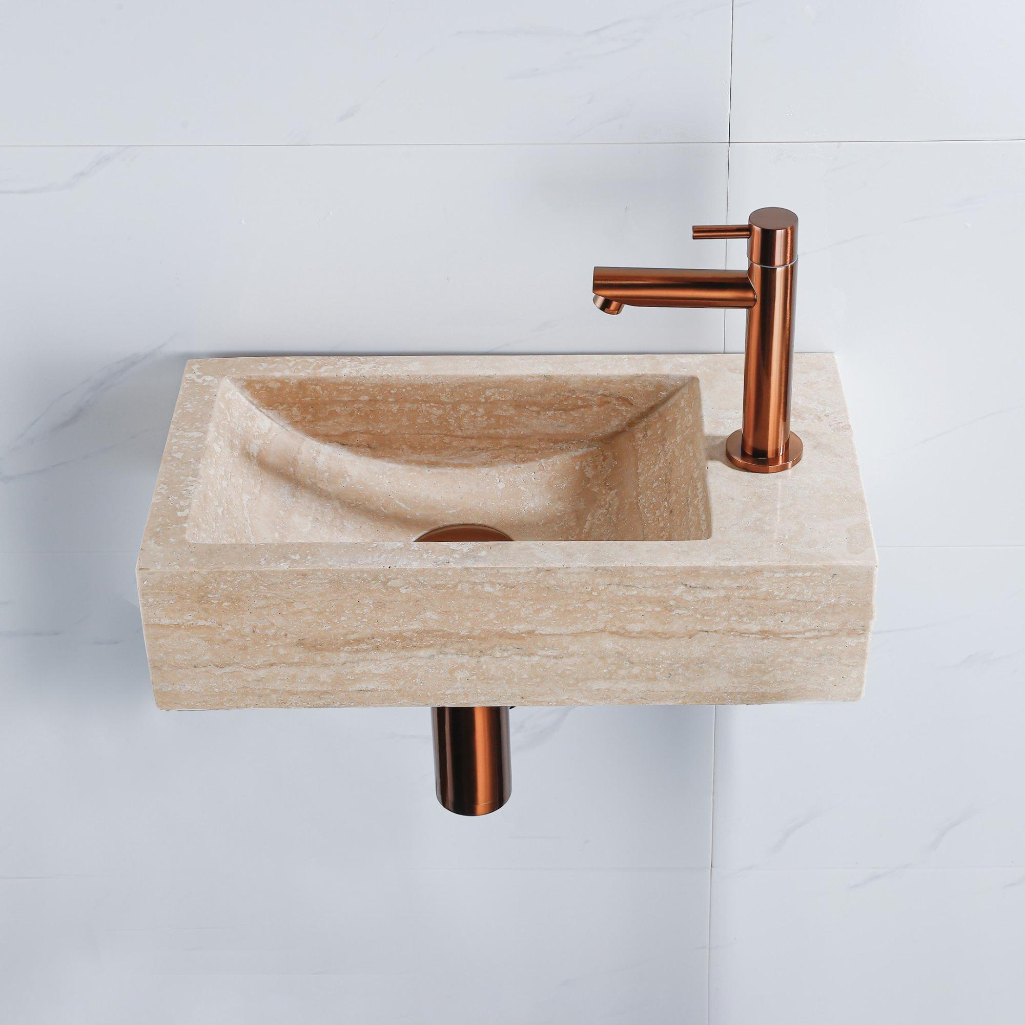 FugaFlow Eccelente Pietra Ensemble de fontaine - 40x22x10cm - trou de robinet à droite - robinet de fontaine en cuivre brossé PVD - bouchon de vidange - siphon abaissé - pierre naturelle marbrée