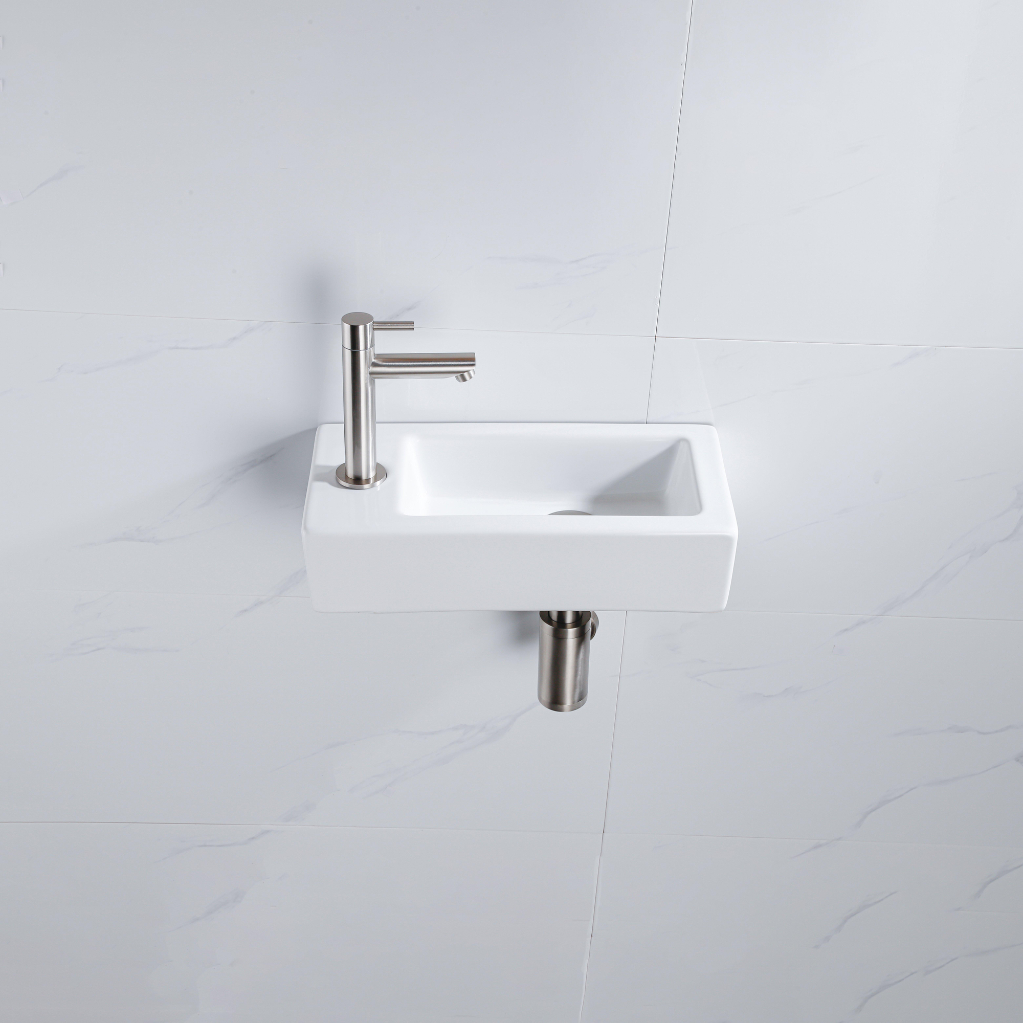 FugaFlow Eccelente Pietra Ensemble de fontaine - 37,5x18,5x9cm - céramique - trou de robinet à gauche - robinet de fontaine en inox brossé - bouchon de vidange - siphon abaissé - Blanc brillant