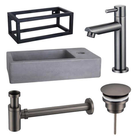 FugaFlow Eccelente Pietra ensemble de lavabo - 40x22x23,5cm - 1 trou de robinet - cadre noir - robinet de lavabo gunmetal - béton