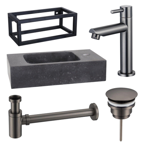 FugaFlow Eccelente Pietra ensemble de lavabo - 40x22x24,5cm - 1 trou de robinet - pierre naturelle - cadre noir - robinet de lavabo gunmetal - noir