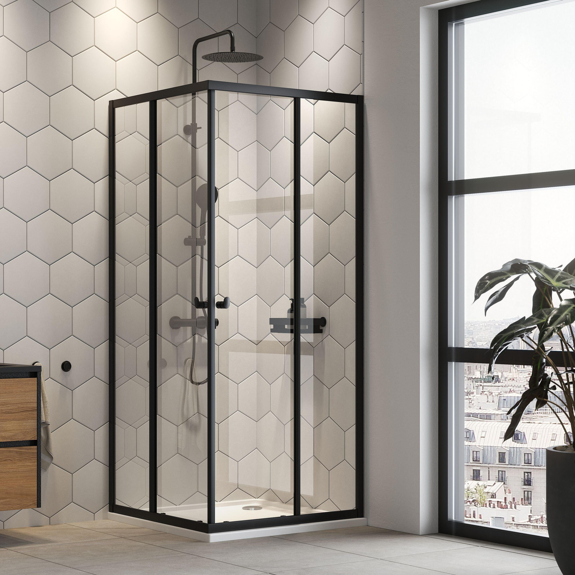 Vous recherchez une solution de douche d’angle élégante et pratique, sans devoir sacrifier de l’espace et du confort ? Cet accès d’angle en quatre parties avec portes coulissantes est idéal pour les salles de bains de taille moyenne à compacte dans lesquelles vous souhaitez utiliser intelligemment l’espace disponible. La combinaison de verre de sécurité clair et d’une finition noire mate crée un look moderne et épuré qui s’intègre parfaitement aussi bien dans des intérieurs industriels que minimalistes. Grâce à la paroi de douche haute, votre espace de douche paraît spacieux et luxueux, tandis que l’accès pratique et les portes coulissantes fluides rendent l’utilisation quotidienne particulièrement confortable. Le verre de sécurité avec revêtement spécial facilite le nettoyage, ce qui rend ce produit particulièrement adapté à ceux qui aiment garder une salle de bains impeccable sans vouloir passer beaucoup de temps à frotter chaque jour.