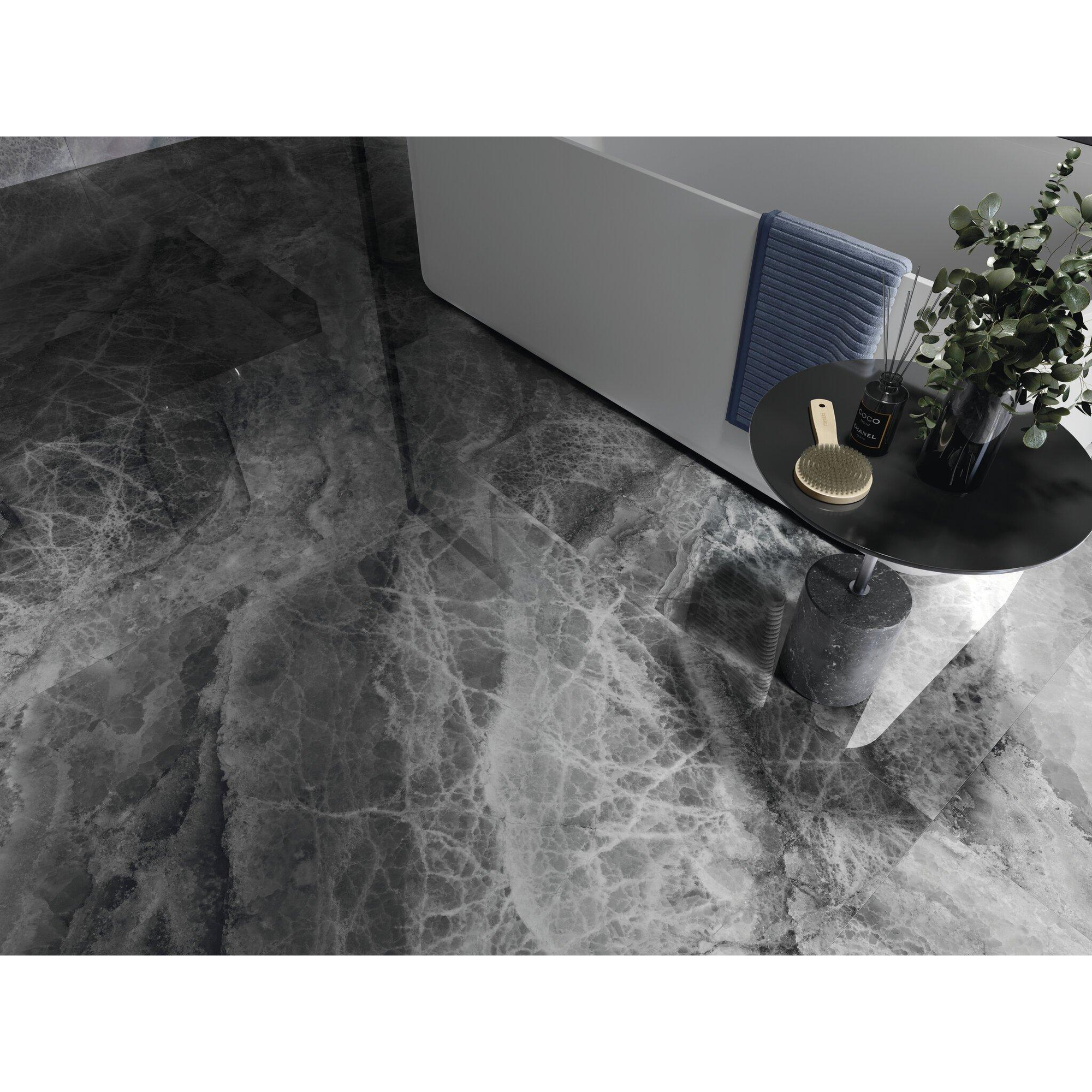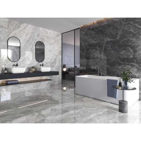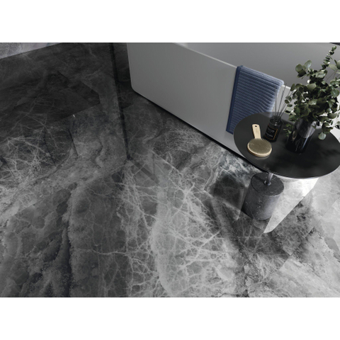 Vous recherchez un carrelage luxueux qui crée immédiatement une ambiance haut de gamme digne d’un hôtel, aussi bien au sol qu’au mur ? Dans ce cas, ce carrelage grand format est un excellent choix. Grâce à son généreux format de 60x120 cm, il offre une apparence épurée et presque sans joints, idéale pour une salle de bains moderne, un séjour élégant ou une entrée chic. La couleur sombre donne de la profondeur et du caractère à la pièce, tandis que le matériau céramique reste pratique à l’usage quotidien. Ce carrelage convient parfaitement comme sol continu en combinaison avec une douche à l’italienne, derrière le lavabo ou comme élément accrocheur dans des toilettes. Grâce à la combinaison d’un aspect pierre naturelle et d’une finition polie, vous profitez de l’apparence luxueuse de la pierre naturelle, mais avec la facilité d’entretien et la durabilité de la céramique.