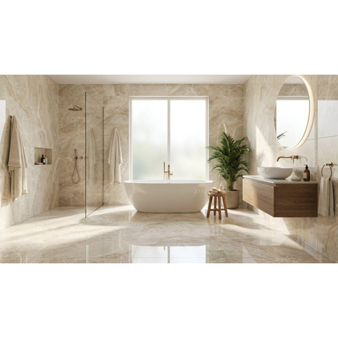 Vous souhaitez un sol confortable et chauffé de manière homogène ? Ce carreau convient au chauffage par le sol, ce qui rend votre salle de bains ou votre espace de vie non seulement esthétique, mais aussi agréablement chaleureux. Grâce aux bords rectifiés, les carreaux peuvent être posés avec des joints étroits, ce qui renforce encore davantage le caractère moderne et luxueux. La finition de couleur polie dans la gamme crème/beige apporte une brillance chic et un look pierre naturelle raffiné, sans nuire à la facilité d’utilisation. Vous créez ainsi un revêtement de sol et de mur haut de gamme qui s’intègre parfaitement dans une salle de bains contemporaine et soigneusement pensée.