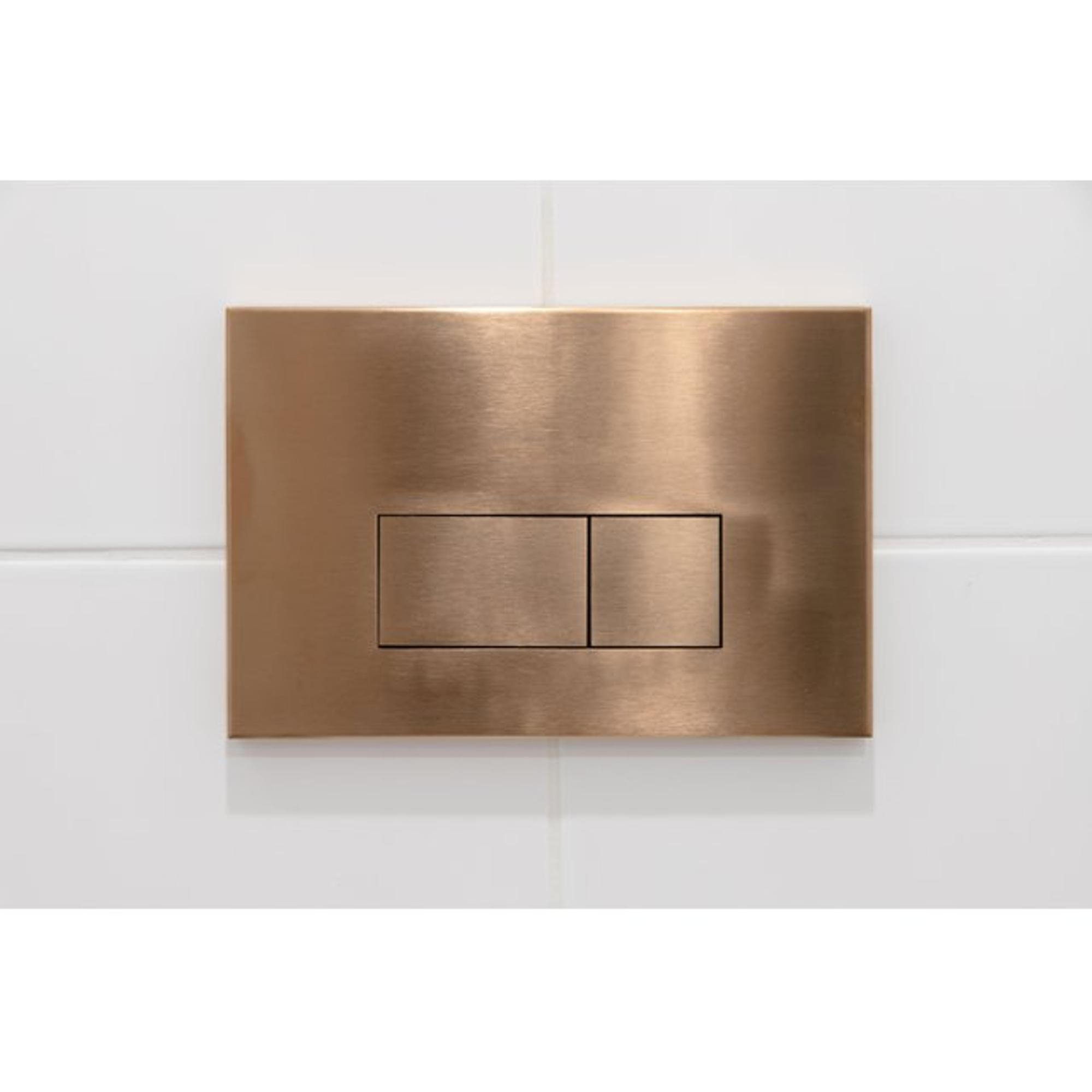 FugaFlow Eccelente Press – Ensemble WC – 56 × 38 × 35 cm – à évacuation profonde – sans bride – réservoir encastré – fermeture amortie (soft-close) – déclipsage rapide (quick release) – abattant WC – plaque de commande métallique en cuivre – boutons recta
