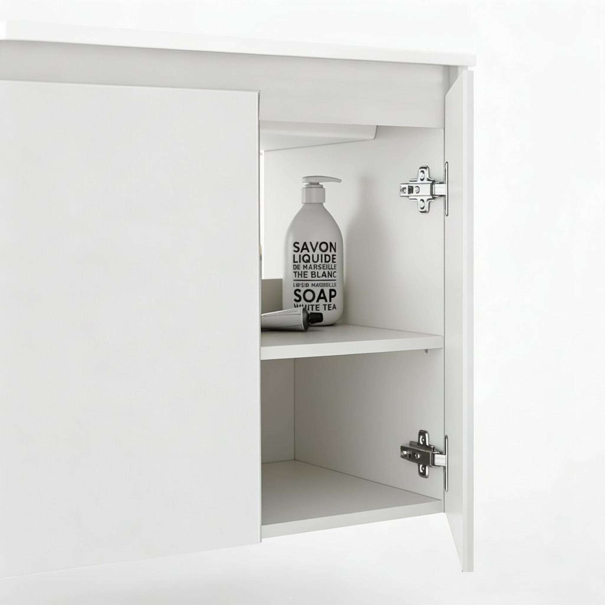 - Deux portes pour un espace de rangement fermé et bien organisé pour vos affaires de salle de bains.