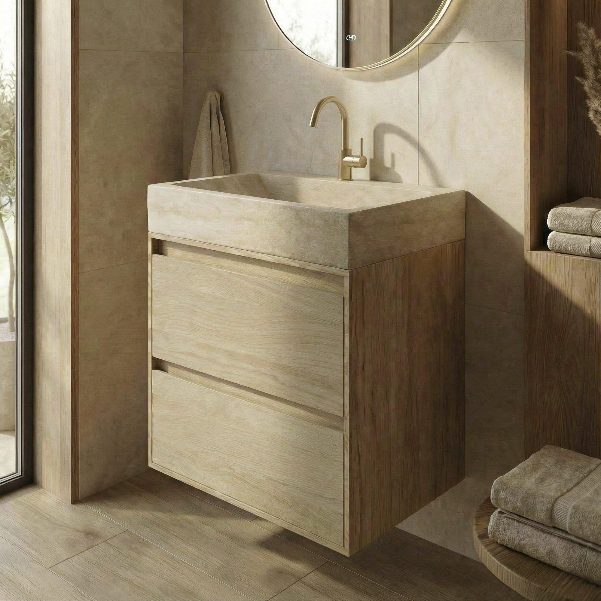 Cet ensemble meuble de salle de bains est conçu pour une utilisation quotidienne et prolongée. Le chêne massif est européen, soigneusement sélectionné et spécialement conçu pour les conditions humides de la salle de bains, de sorte que le meuble reste stable avec un entretien normal. Le travertin est également une pierre naturelle durable, dont la finition adoucie affine la surface et la rend agréable au toucher, tandis que le kit d’entretien fourni aide à préserver la protection et l’apparence. L’ensemble est pratiquement complet : avec le lavabo, le meuble bas, le jeu de consoles, le siphon gain de place et le bouchon de vidage chromé, vous pouvez installer en une seule fois une base de haute qualité. Faites toujours évaluer la charge sur le mur par un professionnel, afin d’être sûr que le mur peut supporter en toute sécurité le lavabo en pierre naturelle et le meuble, et de profiter sans souci de votre nouvelle salle de bains.