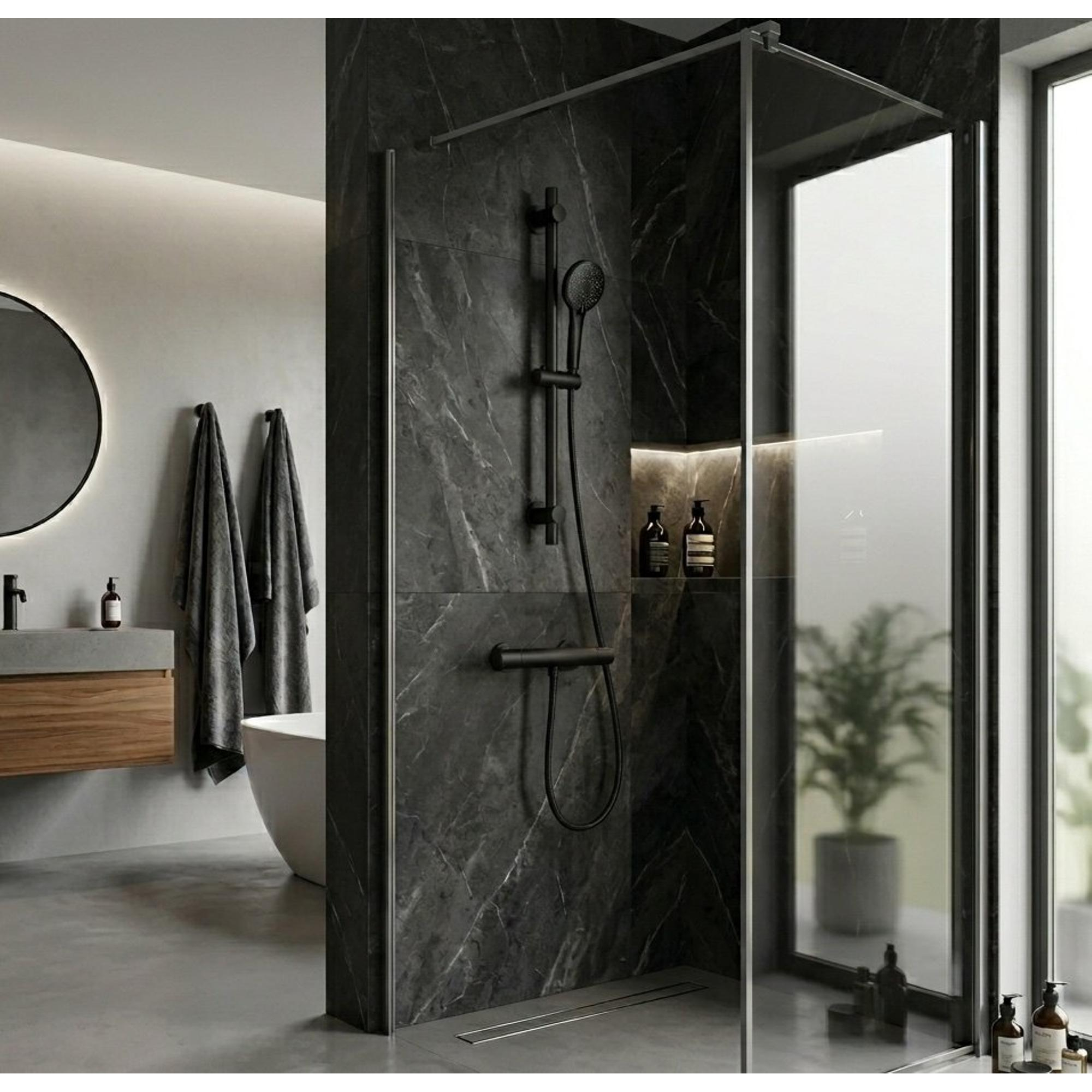 Ce set de douche complet est idéal si vous souhaitez donner à votre salle de bains une apparence moderne et épurée sans sacrifier le confort. Grâce aux lignes épurées, à la finition noire mate et à la combinaison de la barre de douche, de la douchette et du robinet thermostatique, cet ensemble s’intègre parfaitement dans une douche contemporaine ou auprès d’une baignoire avec fonction de douche. Le set est particulièrement adapté si vous appréciez la facilité d’utilisation au quotidien : une commande claire, un jet confortable issu de la douchette ronde et une barre de douche de 70 cm qui vous permet d’ajuster facilement la hauteur, par exemple pour différents membres de la famille. Même dans les salles de bains compactes, cette solution trouve parfaitement sa place, car vous profitez du luxe et de l’esthétique sans avoir besoin d’une grande douche de pluie murale. Si vous recherchez un ensemble de douche fiable, sûr et élégant pour profiter pendant des années d’une douche agréable, c’est un choix judicieux.