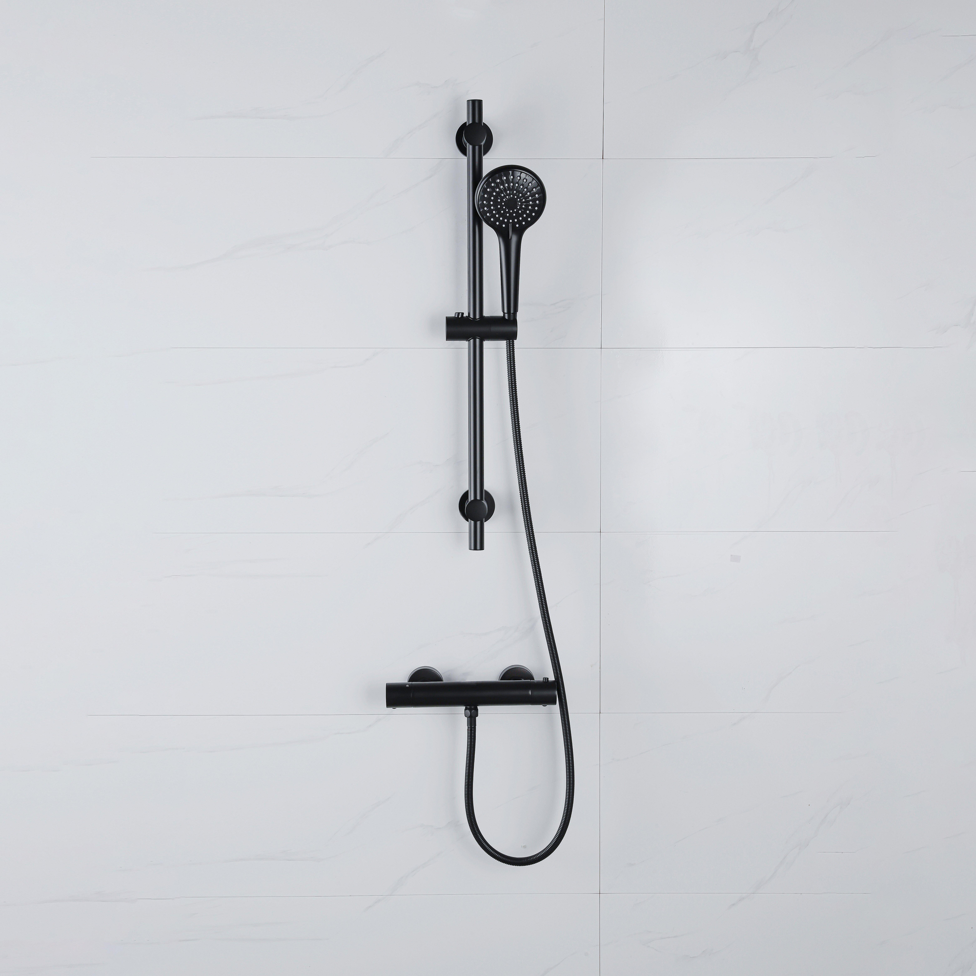 - Ensemble de douche complet avec robinet thermostatique, douchette, barre de douche et flexible de douche métallique pour une solution prête à l’emploi.