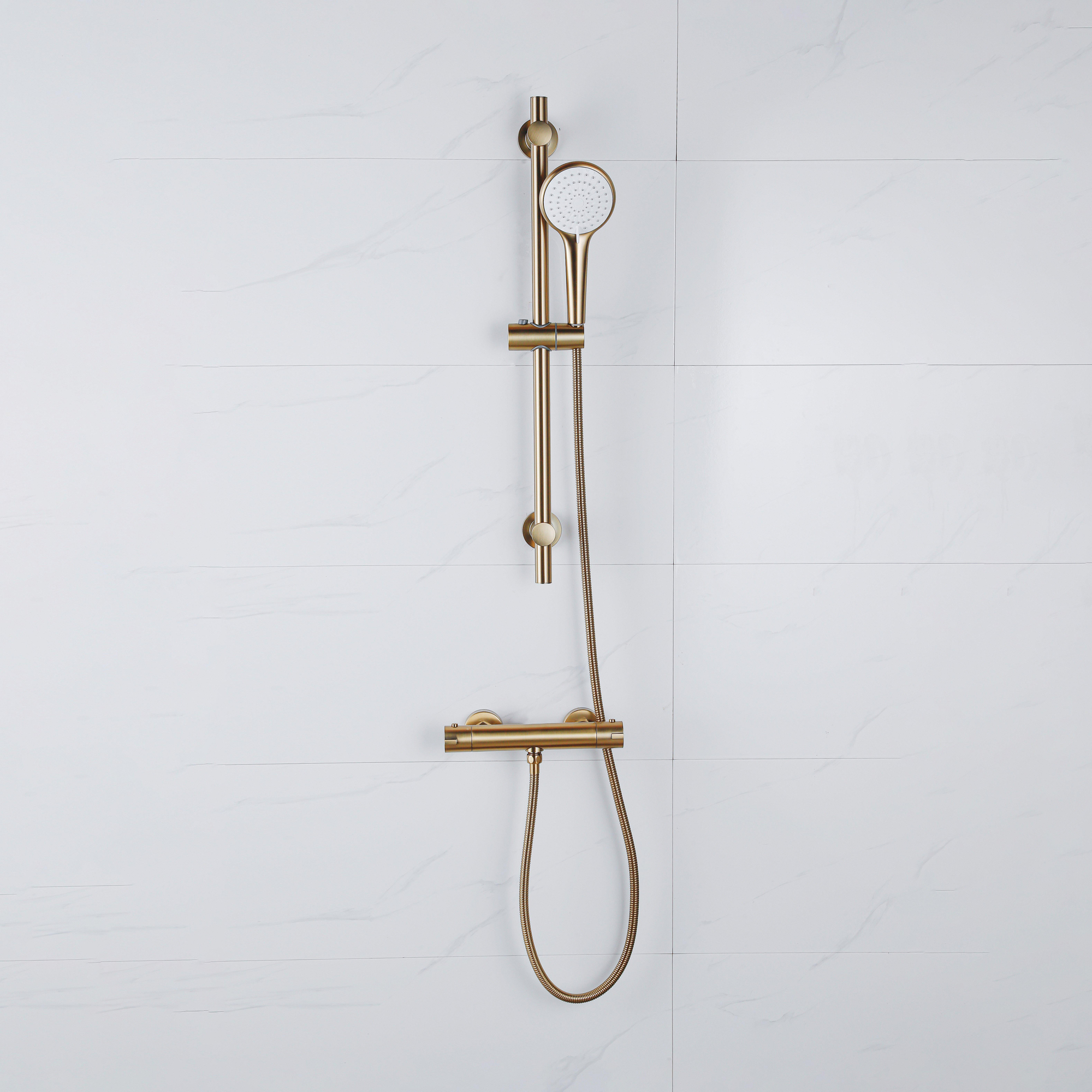 Ce luxueux ensemble de douche est idéal si vous souhaitez offrir à votre salle de bains une mise à niveau élégante tout en profitant d’une douche confortable, sûre et sans souci. La combinaison d’une barre de douche fine, d’une douchette ronde et d’un robinet de douche thermostatique assorti en or mat fait de cet ensemble un superbe accroche-regard dans les salles de bains modernes, d’inspiration hôtel chic et scandinave. Grâce à la douchette compacte, l’ensemble est parfait aussi bien pour les petites salles de bains que pour les vastes douches à l’italienne, et grâce au montage en applique, il convient également très bien aux projets de rénovation où vous souhaitez réutiliser les raccordements existants. Si vous aimez une apparence calme et haut de gamme avec le souci du détail, cet ensemble s’intègre parfaitement dans la salle de bains de vos rêves.