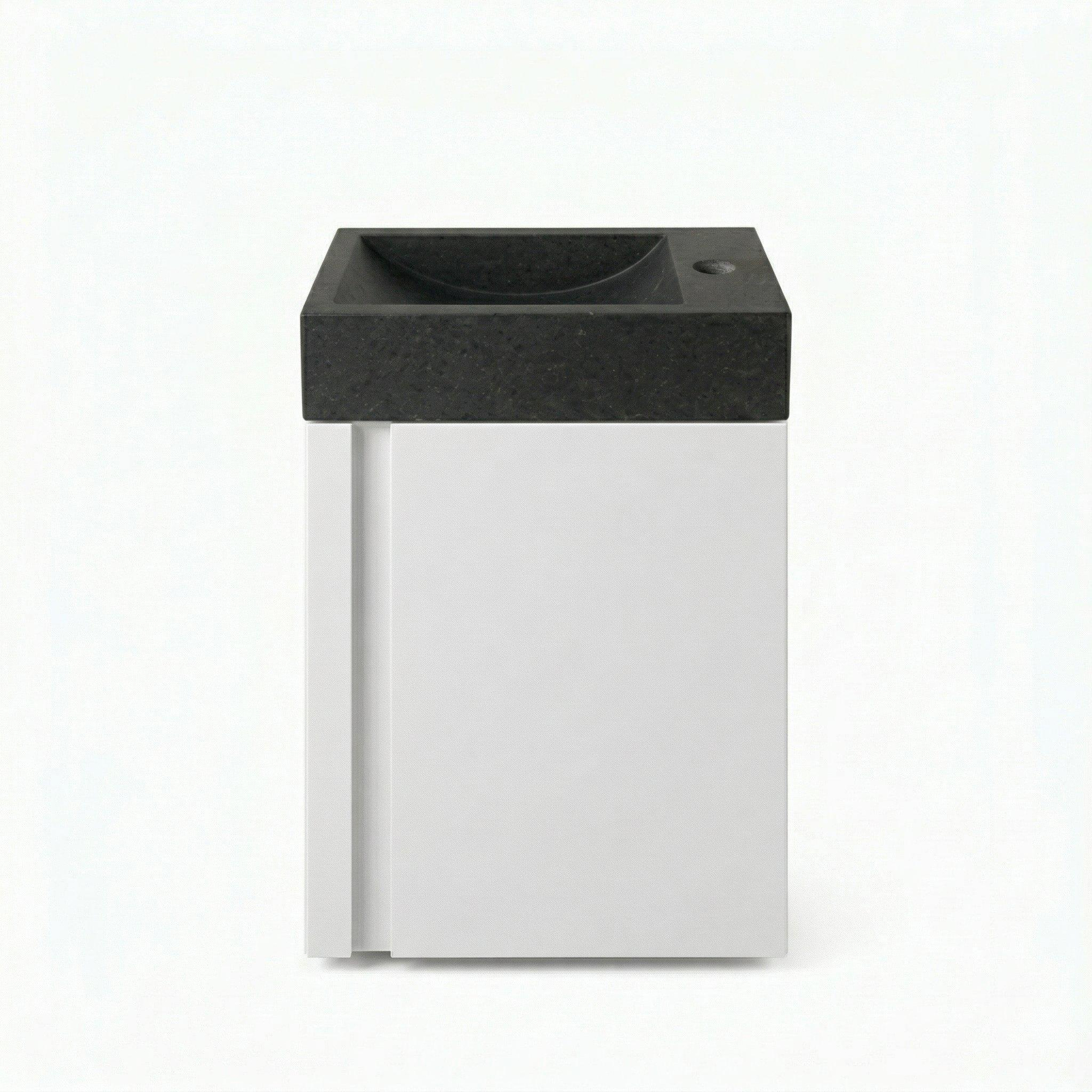 Design moderne blanc mat avec lave-mains en pierre naturelle foncée