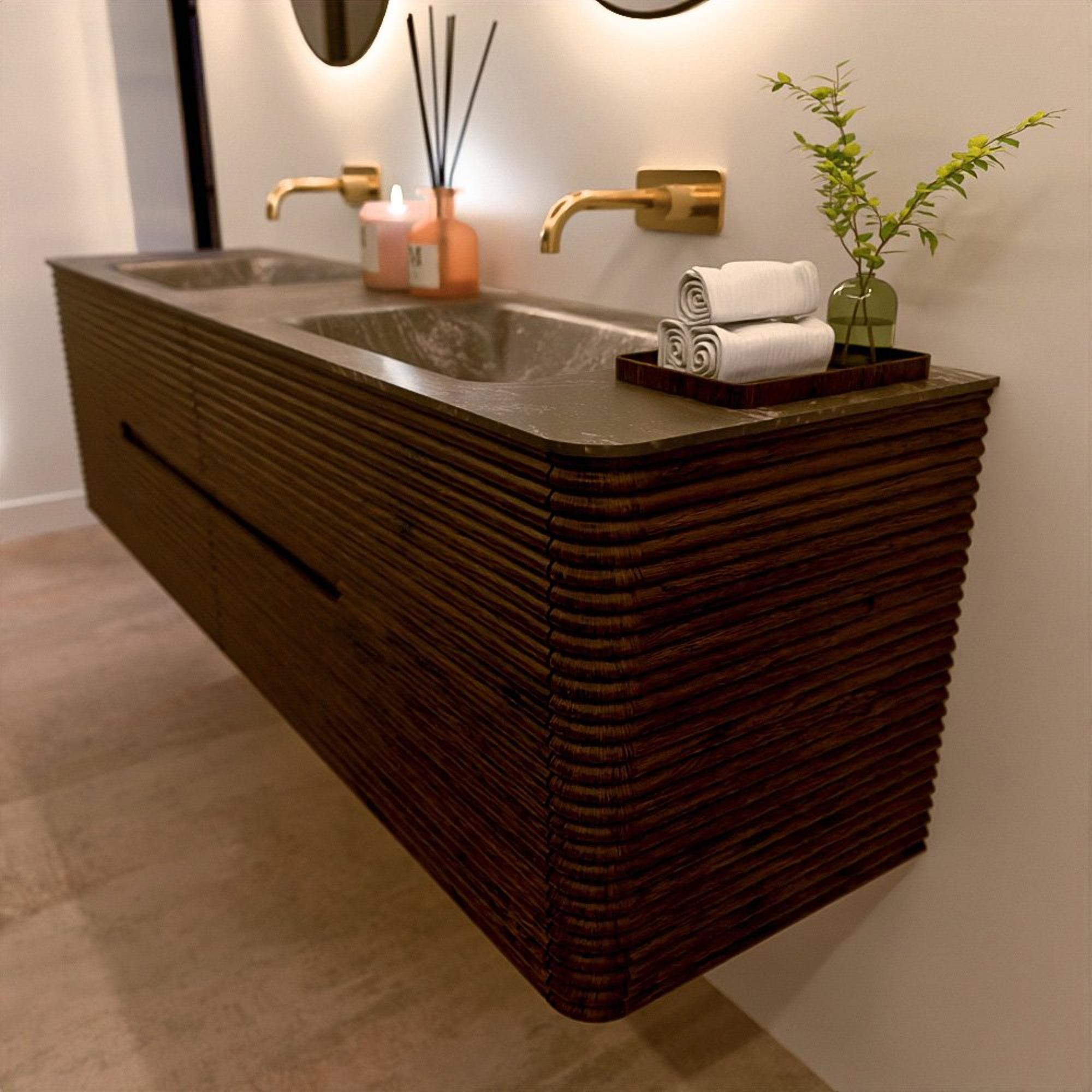 Mondiaz CIRO-DLUX Meuble de salle de bains - 180x45x50cm - plan-vasque Solid surface Lava - 2 vasques Double - sans trous de robinet - 4 tiroirs - Noyer