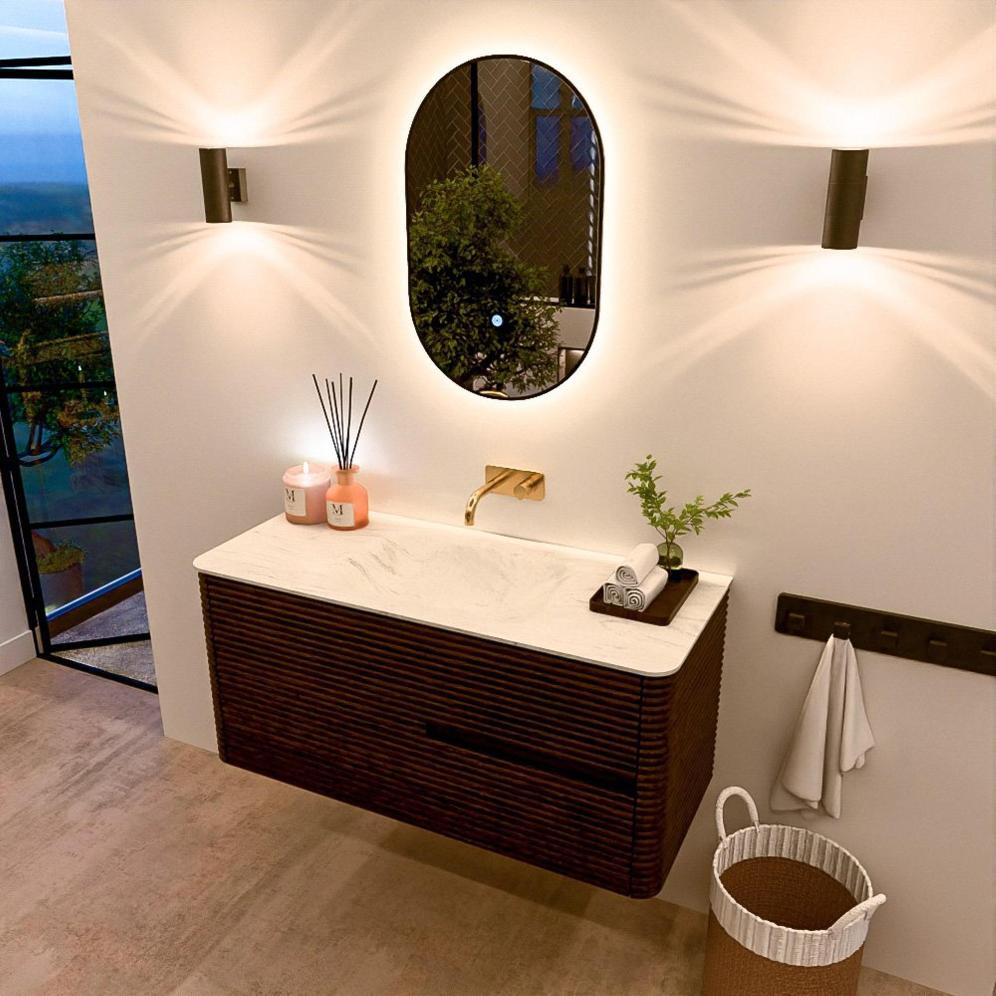 Mondiaz CIRO-DLUX Ensemble de meubles de salle de bains - 110x45x50cm - plan-vasque solid surface Opalo - 1 lavabo central - sans trous de robinetterie - 2 tiroirs - Noyer