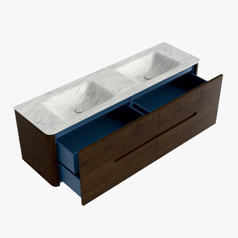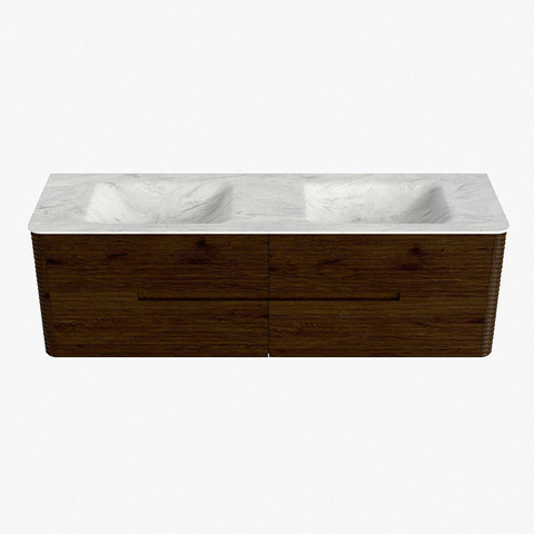 Mondiaz CIRO-DLUX Ensemble de meubles de salle de bains - 160x45x50cm - Plan-vasque solid surface Opalo - 2 vasques double - sans trous de robinet - 4 tiroirs - Noyer