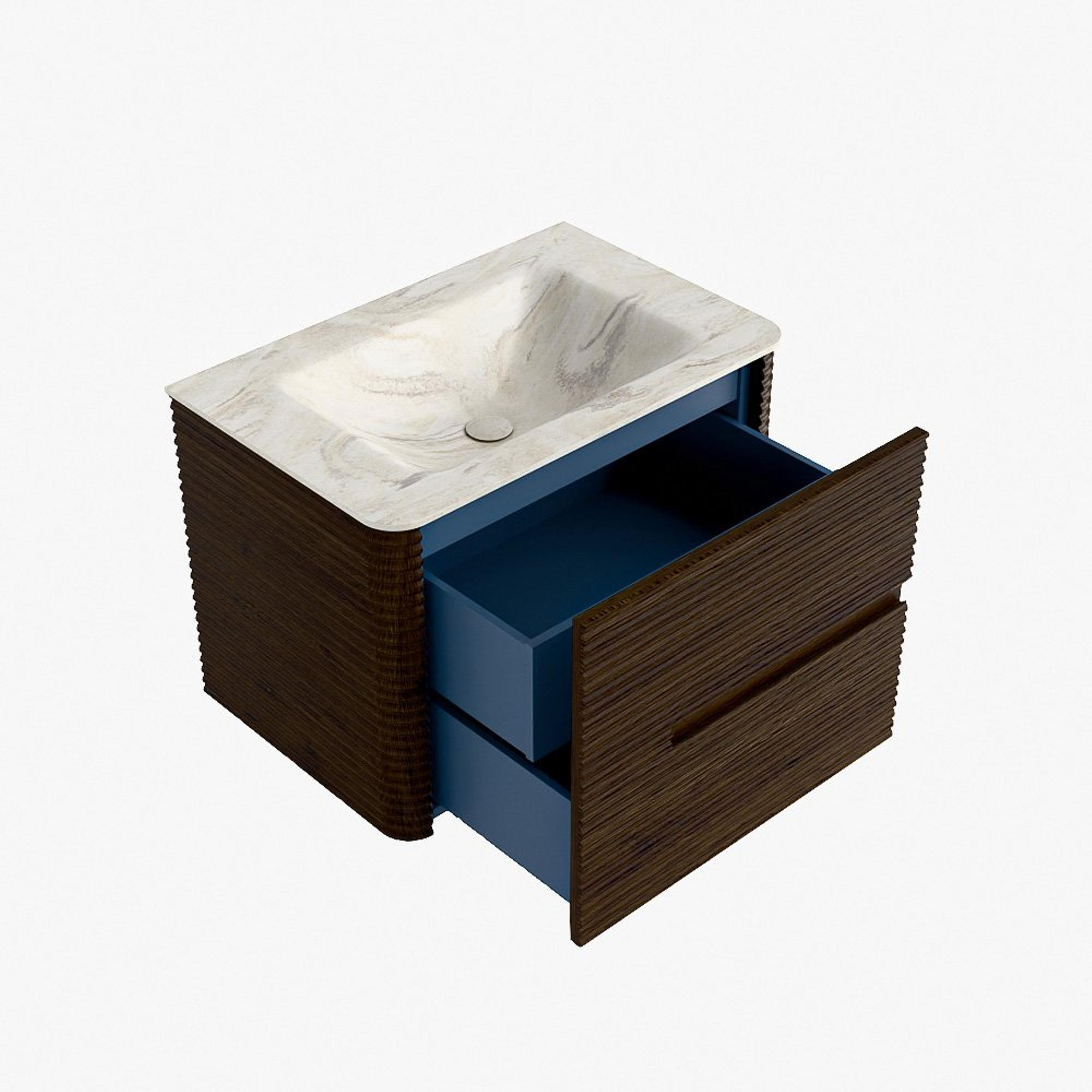 La praticité est un élément essentiel de la gamme CIRO. Le meuble dispose d’un grand tiroir avec un tiroir intérieur supplémentaire, idéal pour ranger de manière organisée tous les articles quotidiens de la salle de bain. Grâce à la poignée intégrée et au mécanisme de fermeture douce, la façade reste sobre, élégante et épurée.