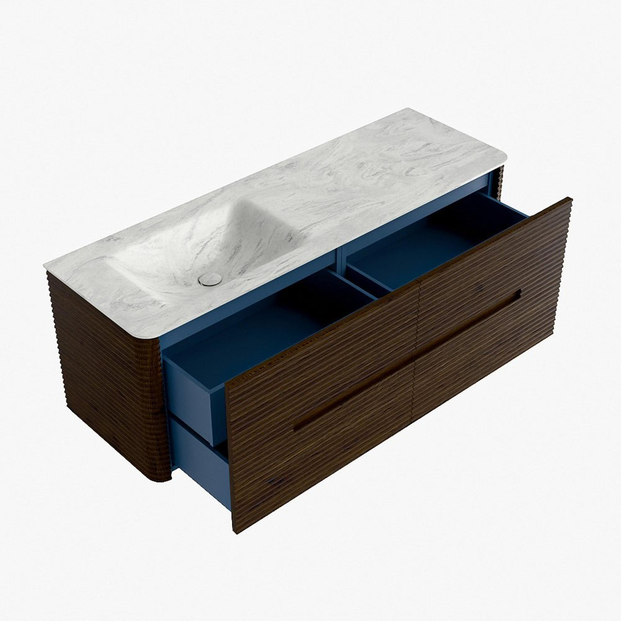 La praticité est un élément essentiel de la gamme CIRO. Le meuble dispose d’un grand tiroir avec un tiroir intérieur supplémentaire, idéal pour ranger de manière organisée tous les articles quotidiens de la salle de bain. Grâce à la poignée intégrée et au mécanisme de fermeture douce, la façade reste sobre, élégante et épurée.