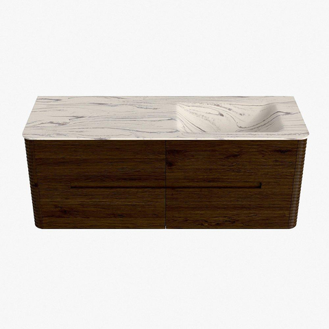 Mondiaz CIRO-DLUX Ensemble de meubles de salle de bains - 130x45x50cm - Vasque en solid surface Nata - 1 bassin à droite - sans trous de robinet - 4 tiroirs - Noyer