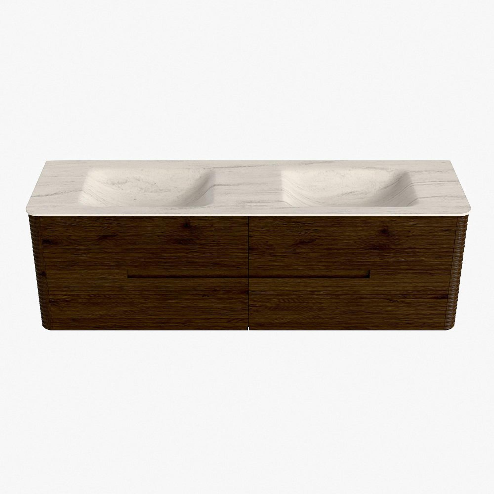 Mondiaz CIRO-DLUX Meuble de salle de bains - 160x45x50cm - Plan vasque Solid surface Meli - 2 bassins Double - sans trous de robinetterie - 4 tiroirs - Noyer