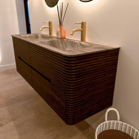 Mondiaz CIRO-DLUX Meuble de salle de bains - 140x45x50cm - Plan vasque solid surface Sombra - 2 vasques double - 2 trous de robinetterie - 4 tiroirs - Noyer