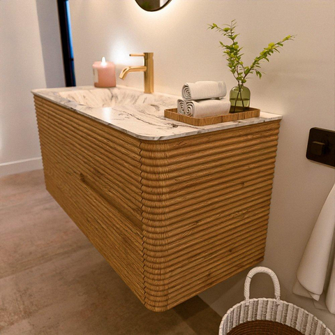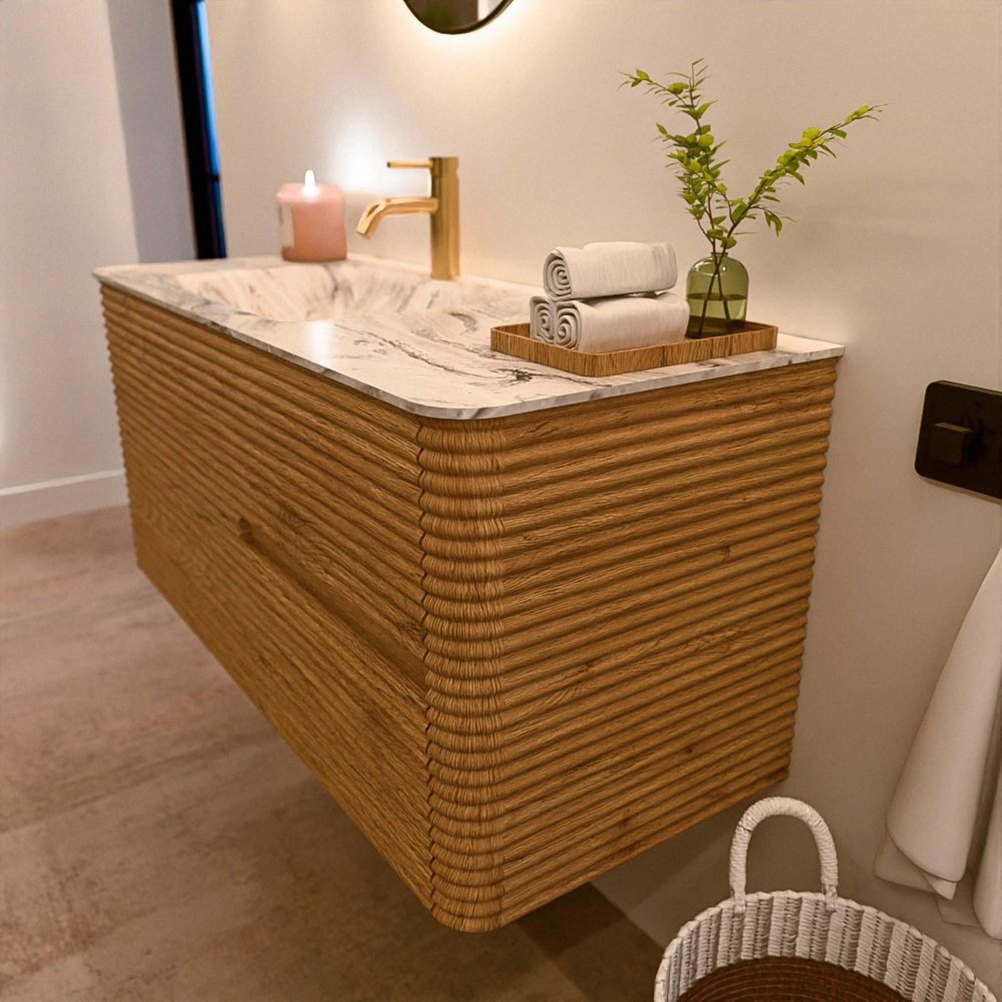 Mondiaz CIRO-DLUX Meuble de salle de bains - 110x45x50cm - Plan vasque solid surface Glace - 1 vasque à gauche - 1 trou pour robinet - 2 tiroirs - Chêne