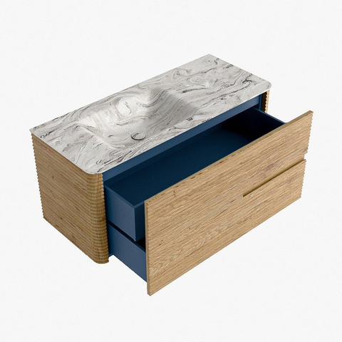 La praticité est un élément essentiel de la gamme CIRO. Le meuble dispose d’un grand tiroir avec un tiroir intérieur supplémentaire, idéal pour ranger de manière organisée tous les articles quotidiens de la salle de bain. Grâce à la poignée intégrée et au mécanisme de fermeture douce, la façade reste sobre, élégante et épurée.