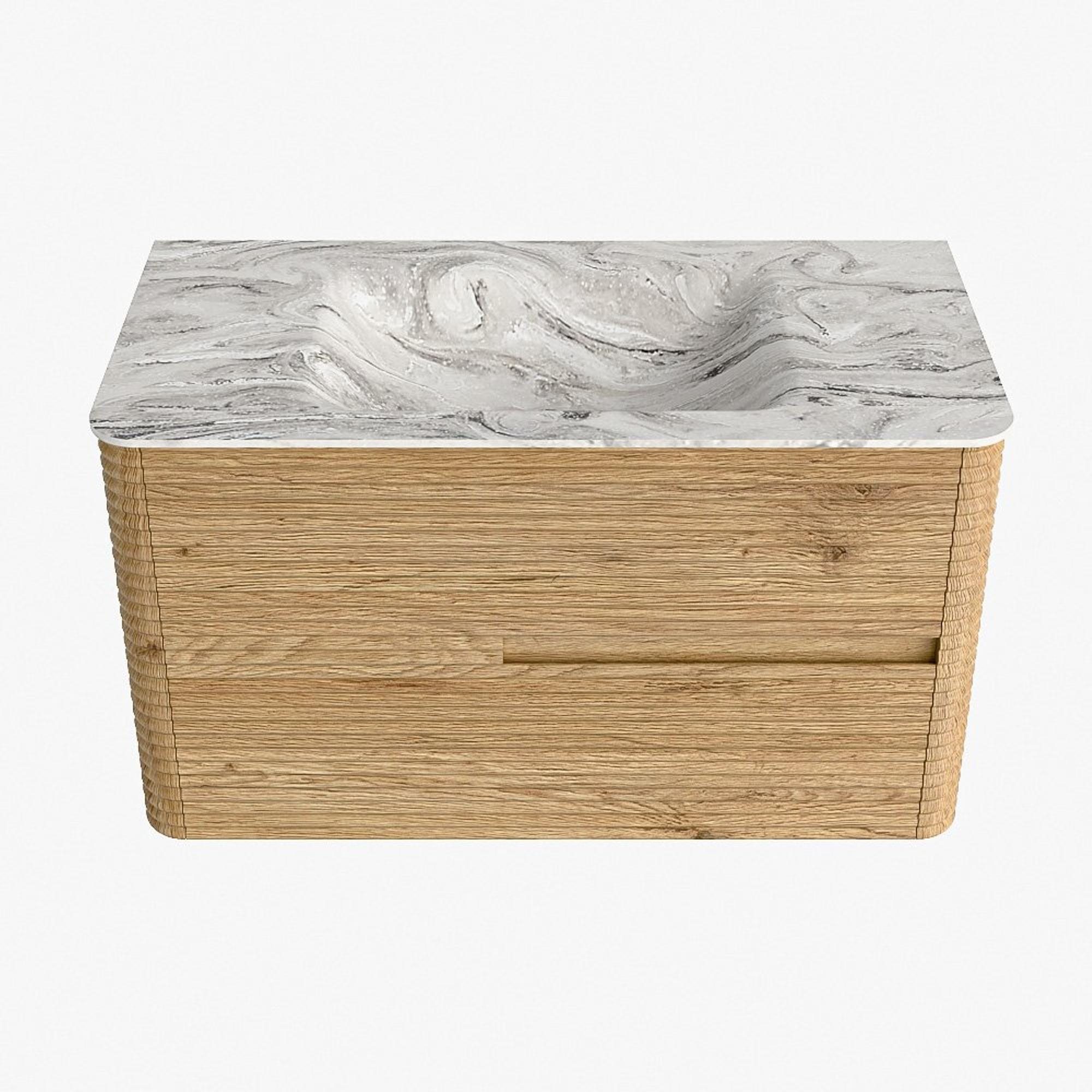 Mondiaz CIRO-DLUX Meuble de salle de bains - 90x45x50cm - lavabo solid surface Glace - 1 vasque centrale - sans trous de robinetterie - 2 tiroirs - chêne