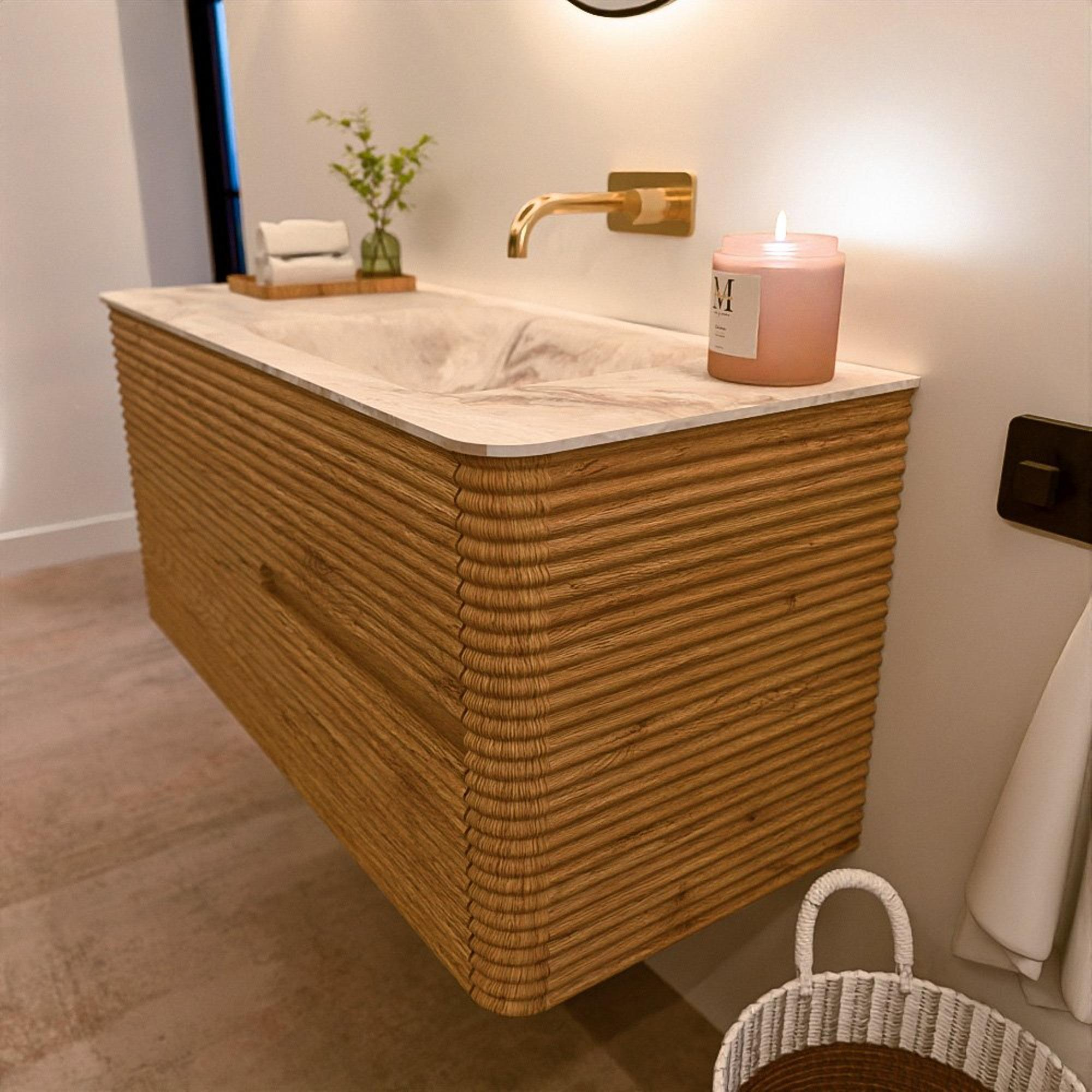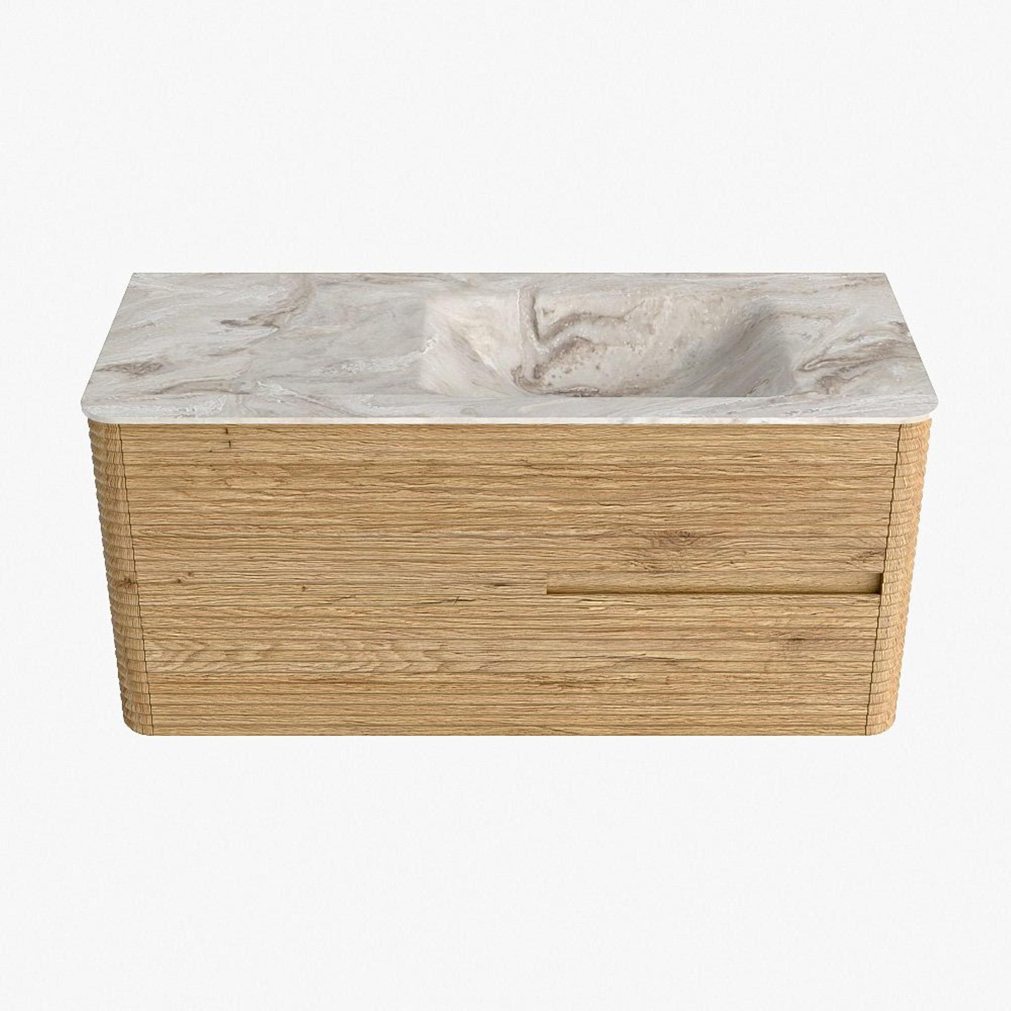 Mondiaz CIRO-DLUX Meuble de salle de bains - 110x45x50cm - lavabo solid surface Frappe - 1 vasque à droite - sans trous de robinetterie - 2 tiroirs - Chêne