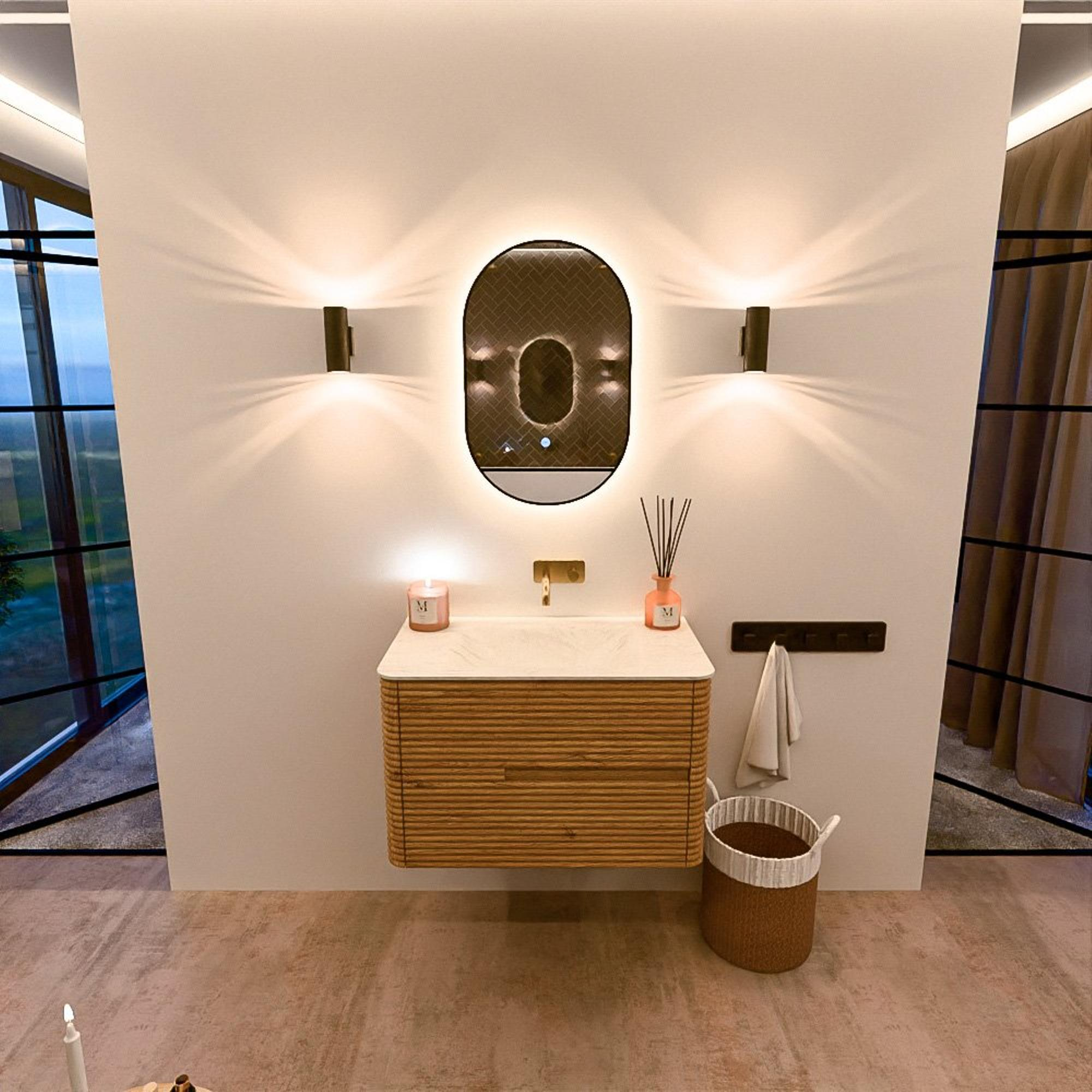 Mondiaz CIRO-DLUX Meuble de salle de bains - 80x45x50cm - Plan vasque solid surface Opalo - 1 lavabo au milieu - sans trous de robinet - 2 tiroirs - Chêne