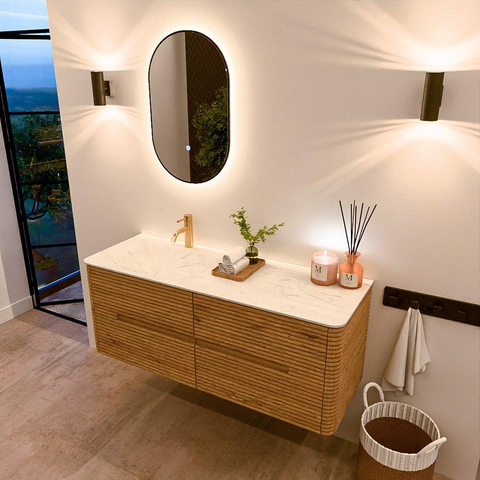 Mondiaz CIRO-DLUX Ensemble de meubles de salle de bains - 130x45x50cm - Plan vasque solid surface Opalo - 1 vasque à gauche - 1 trou de robinet - 4 tiroirs - Chêne